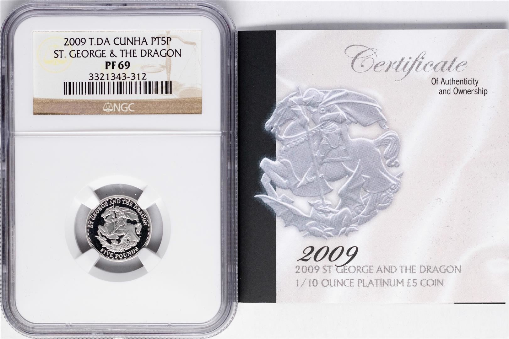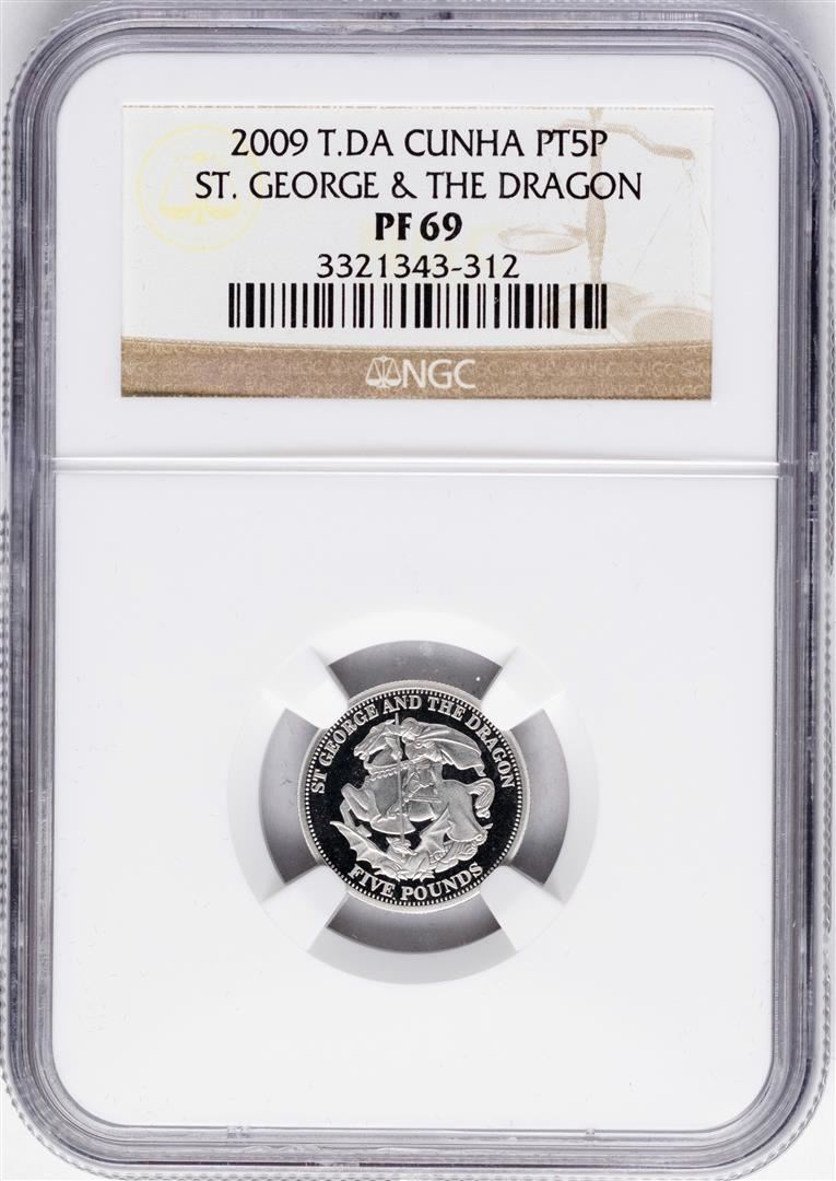 One 2009 T.DA Cunha 5 Pounds 1/10 oz St. George & Dragon Platinum Coin NGC PF69. NGC Certified.