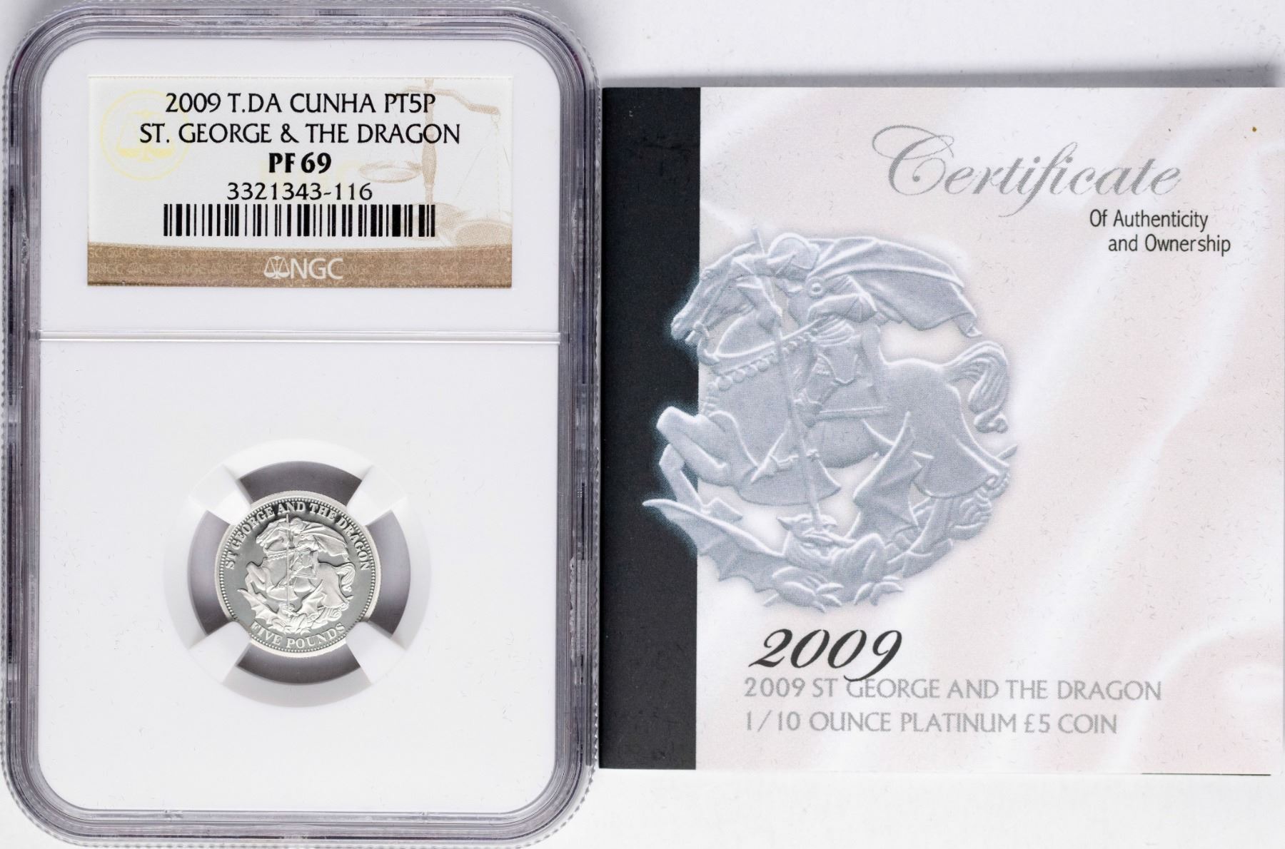 One 2009 T.DA Cunha 5 Pounds 1/10 oz St. George & Dragon Platinum Coin NGC PF69.