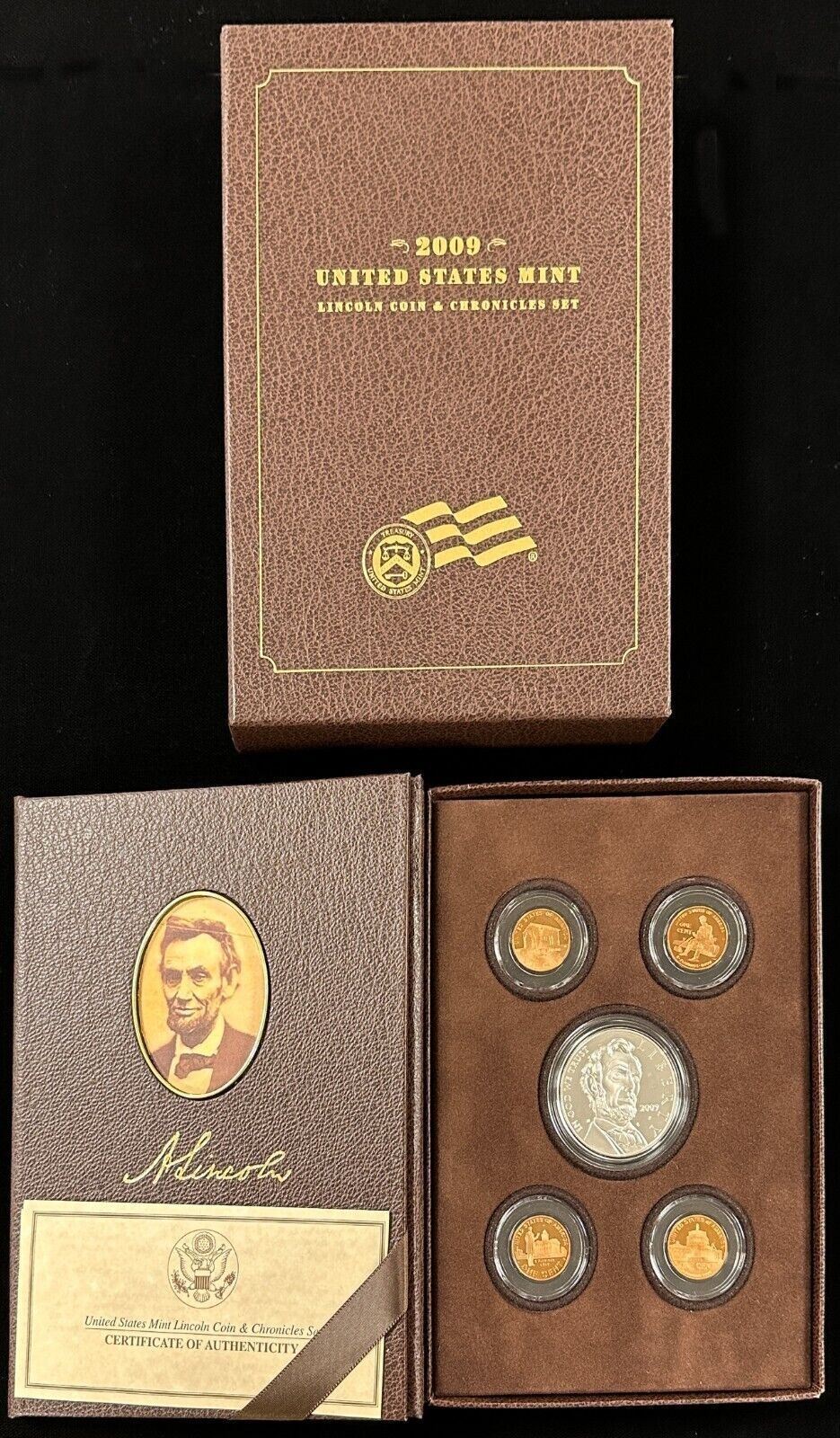 2009 US Mint Lincoln 5 Coin and Chronicles Set With COA Silver Dollar