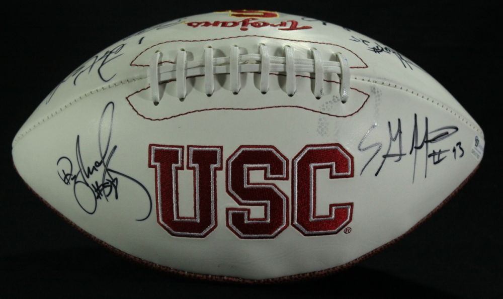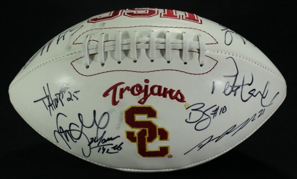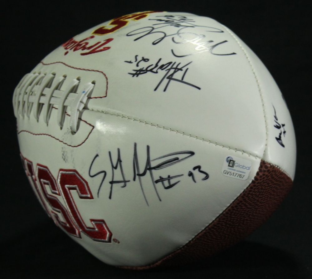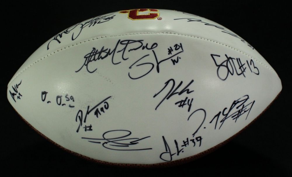 Full-size USC Logo Football. Hand-signed in black felt-tip pen by (18) players. Autographs include Mark Sanchez, Brian Cushing, Rey Maualuga, Pete Carroll, Everson Griffin, Stafon Johnson, Joe McKnight and others. Includes a Global Authentics (GA) hologram and matching COA for authenticity purposes.