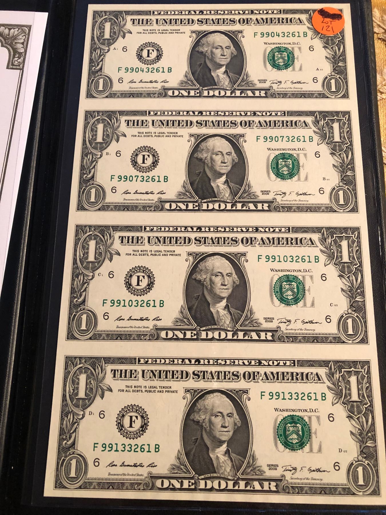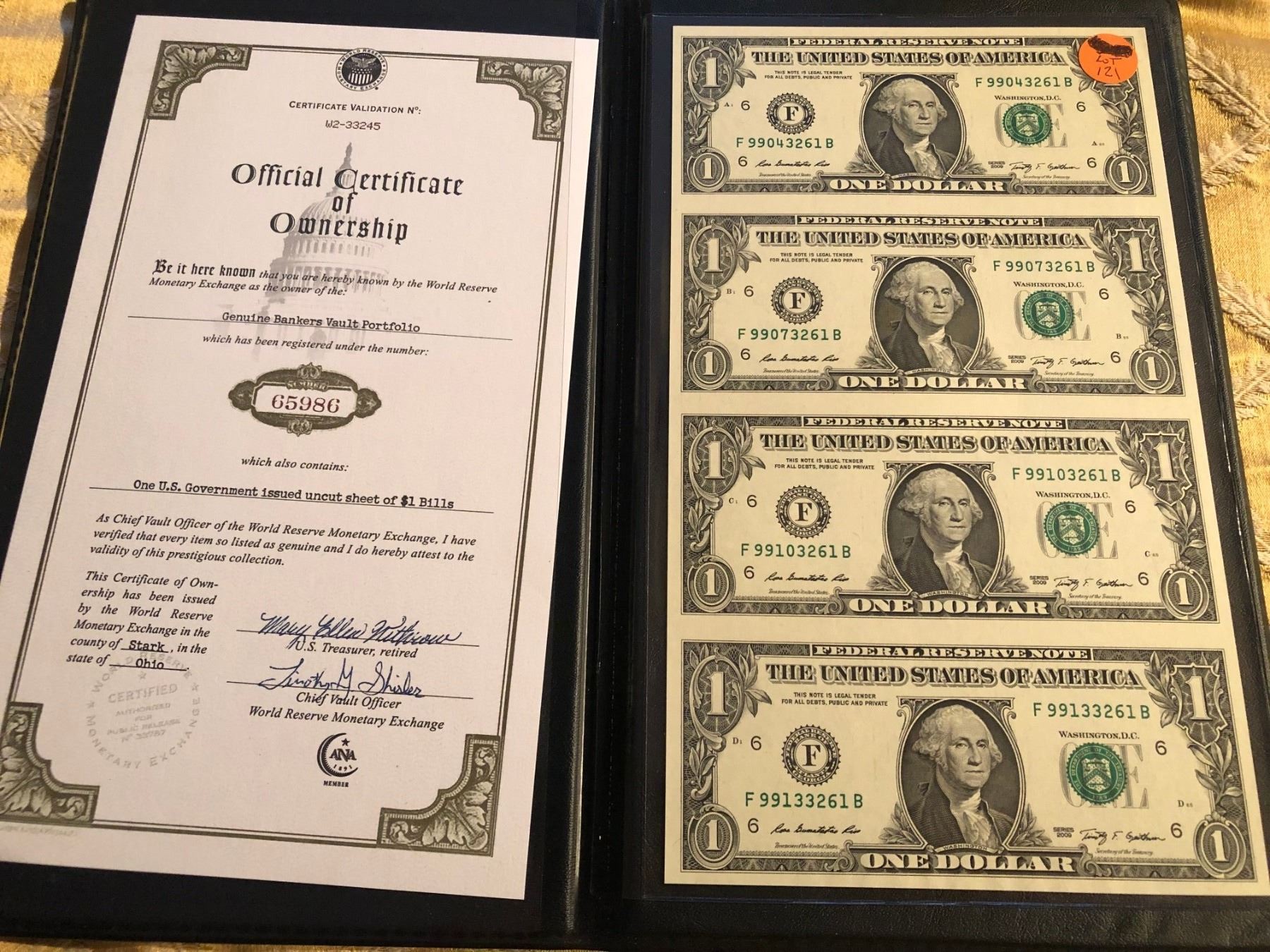 2009 Uncut Sheet 1 Dollar Bills with Certificate Signed by Treasurer and Cheif of Vault Officer