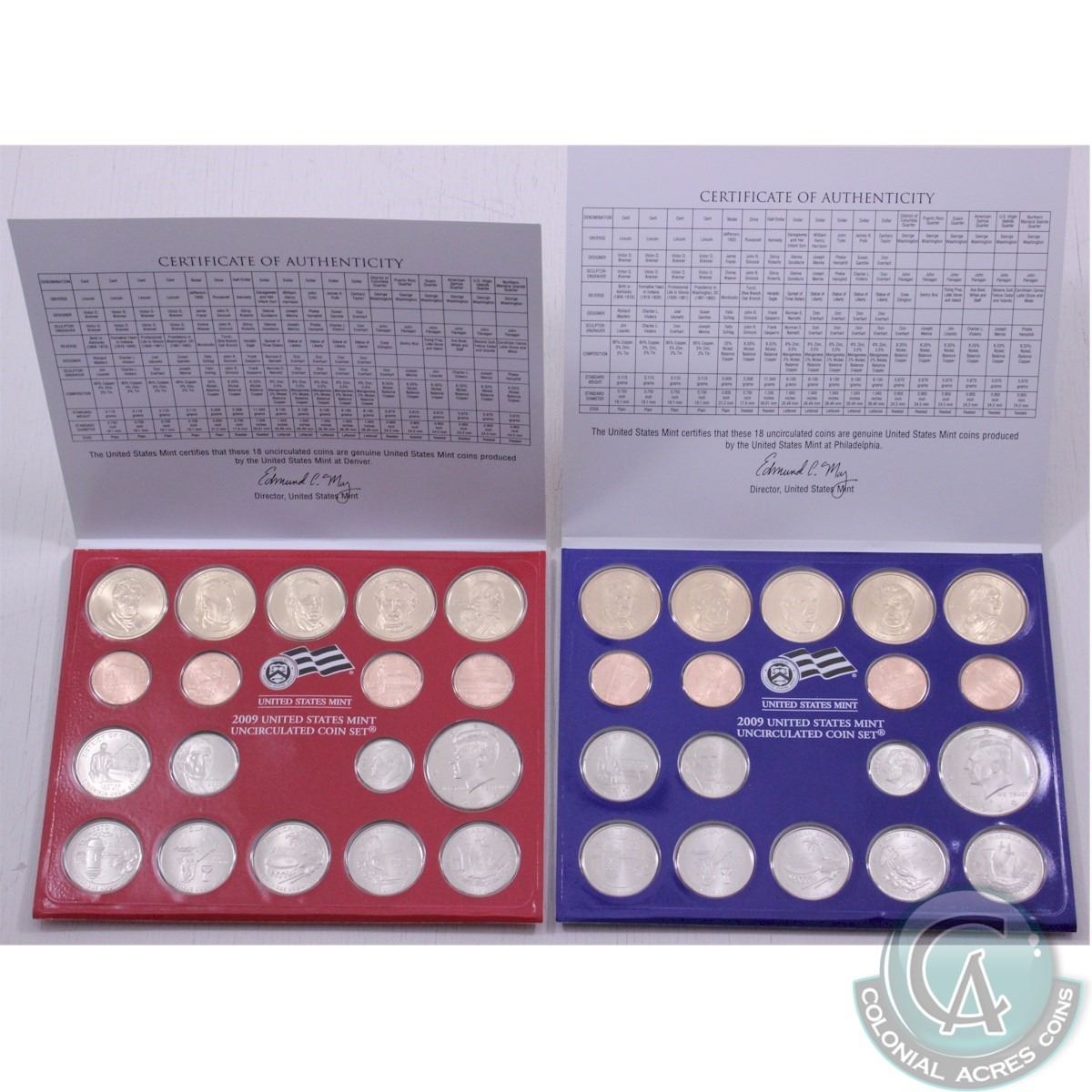2009 United States Mint 18-coin Uncirculated Sets. You will receive both of the Uncirculated Sets issued by the Philadelphia and Denver ("P & D") Mints in 2009. (2pcs)