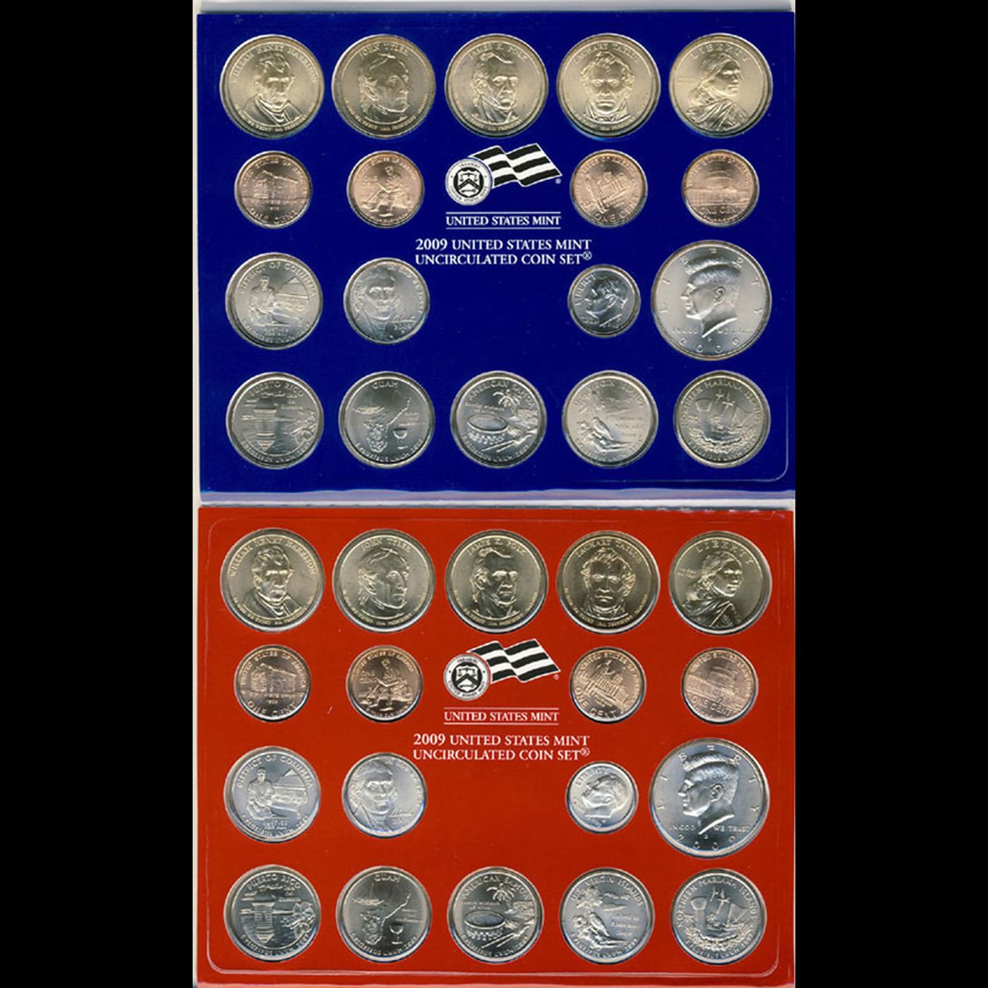 2009 United States Mint Set in Original Government Packaging! 36 Coins Inside!. The annual uncirculated coin set expanded to the largest number of coins in the history of the offering. The 2009 Mint Set contained an incredible 36 different coins, as the US Mint introduced two new series with rotating designs. The 2009 Lincoln Cents were issued with four different designs to mark the bicentennial of the birth of Abraham Lincoln. The designs represented his birthplace and childhood, formative years, professional life, and presidency. As a capstone to the State Quarters, a separate program was introduced to honor the other non-state jurisdictions of the United States. The six different quarters featured the District of Columbia, Puerto Rico, Guam, American Samoa, the U.S. Virgin Islands, and the Northern Mariana Islands. The release of Presidential Dollars continued with coins featuring William Henry Harrison, John Tyler, James K. Polk, and Zachary Taylor. Finally, a new series of Native American Dollars began, with the first annually rotating design depicting the Three Sisters method of planting on the reverse. Coins which featured constant designs were limited to only the Jefferson Nickel, Roosevelt Dime, and Kennedy Half Dollar. As another special aspect to the release of the Bicentennial Lincoln Cents, the coins would be struck in a composition of 95% copper, 3% zinc, and 2% tin, identical to the original composition when the series began in 1909. (Since 1982, the standard composition of the one cent coin had been changed to 97.5% zinc and 2.5% copper.) When the sets were finally issued, a small message was included within each set warning of potential tarnishing of the 2009 Lincoln Cents over time. Packaging for the sets was larger in size, to allow for another row of coins, but otherwise retained the same style. The outer illustrations displayed skylines of Philadelphia and Denver at dusk. The packs opened to reveal the coins neatly displayed in blisters with coin specification information above. The packaging allowed both sides of the coins, as well as the edges to remain visible.