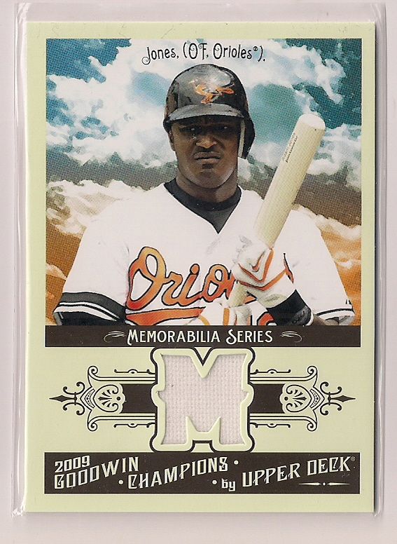 2009 Upper Deck Goodwin Champions Adam Jones Game-Used Material Insert Card. This Insert features a Solid White piece of Game-Used Material. Card is Near Mint.