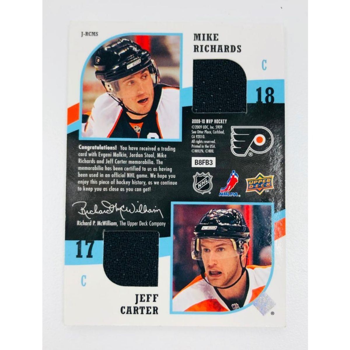 2009 Upper Deck MVP Hockey TwoOnTwo Quad Game Used Jersey Memorabilia - Mike Richards, Jeff Carter,