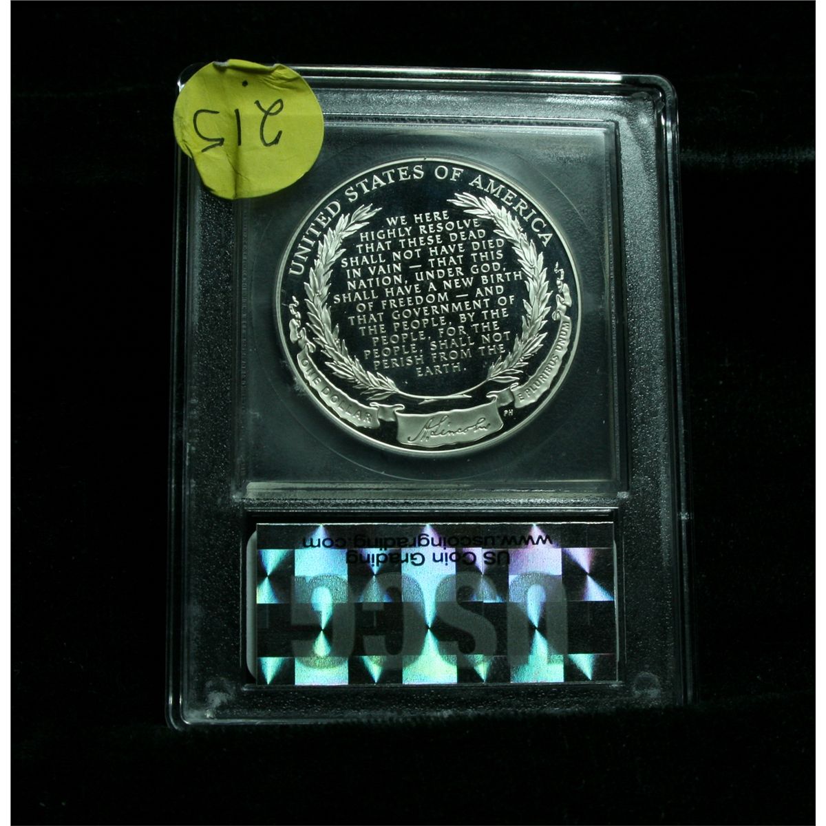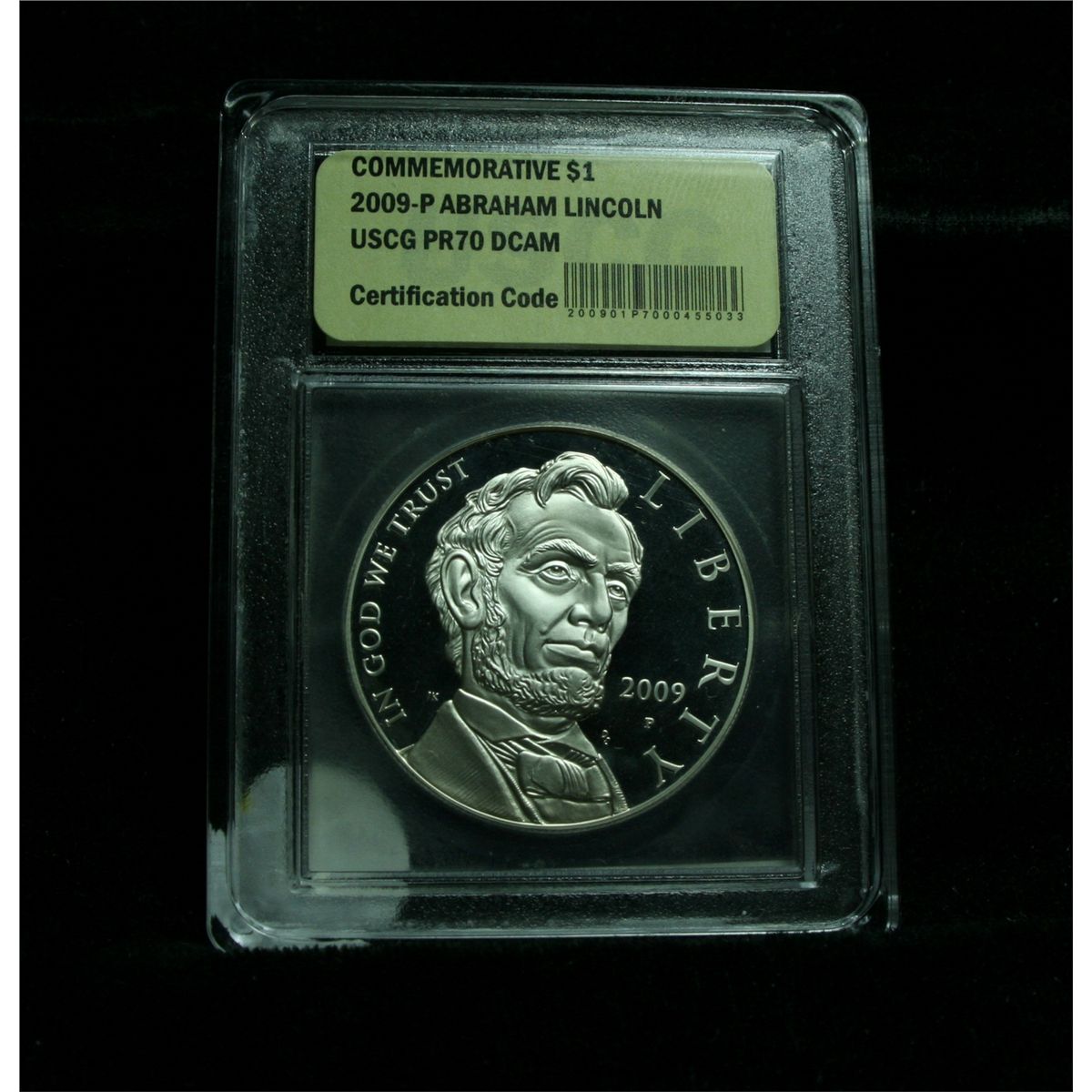 The 2009 Abraham Lincoln Silver Dollar was issued to commemorate the 200th anniversary of his birth. 90% Silver Dollar Proof Encapsulated and Graded ms70 by USCG. PCGS Price Guide lists ms70 at $200. Estimated Value $100