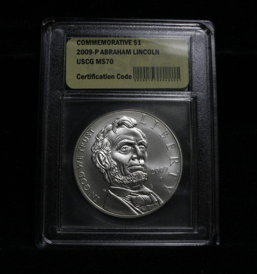 The 2009 Abraham Lincoln Silver Dollar was issued to commemorate the 200th anniversary of his birth. 90% Silver Dollar BU Encapsulated and Graded ms70 by USCG. PCGS list ms70 at $200. Estimated Value $100