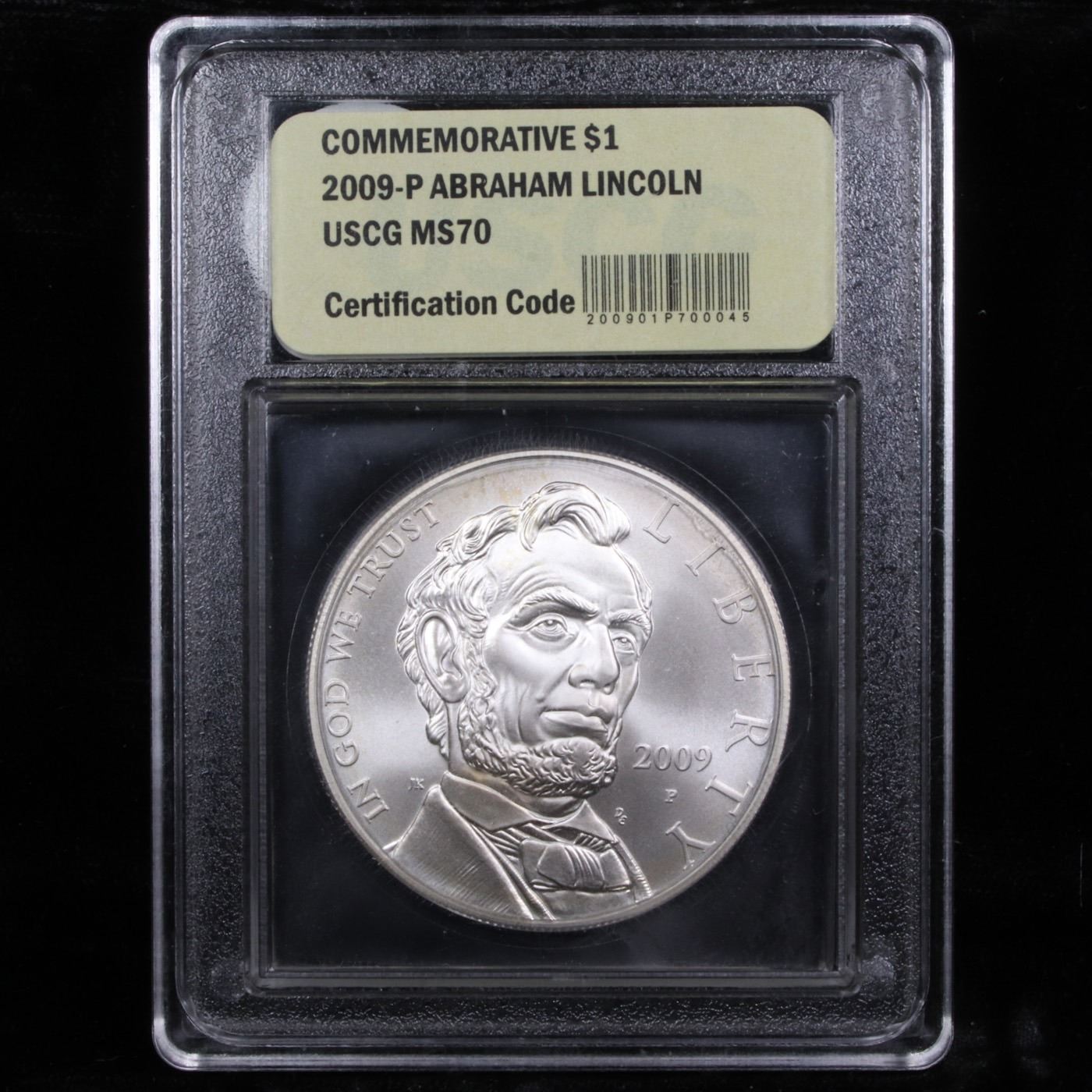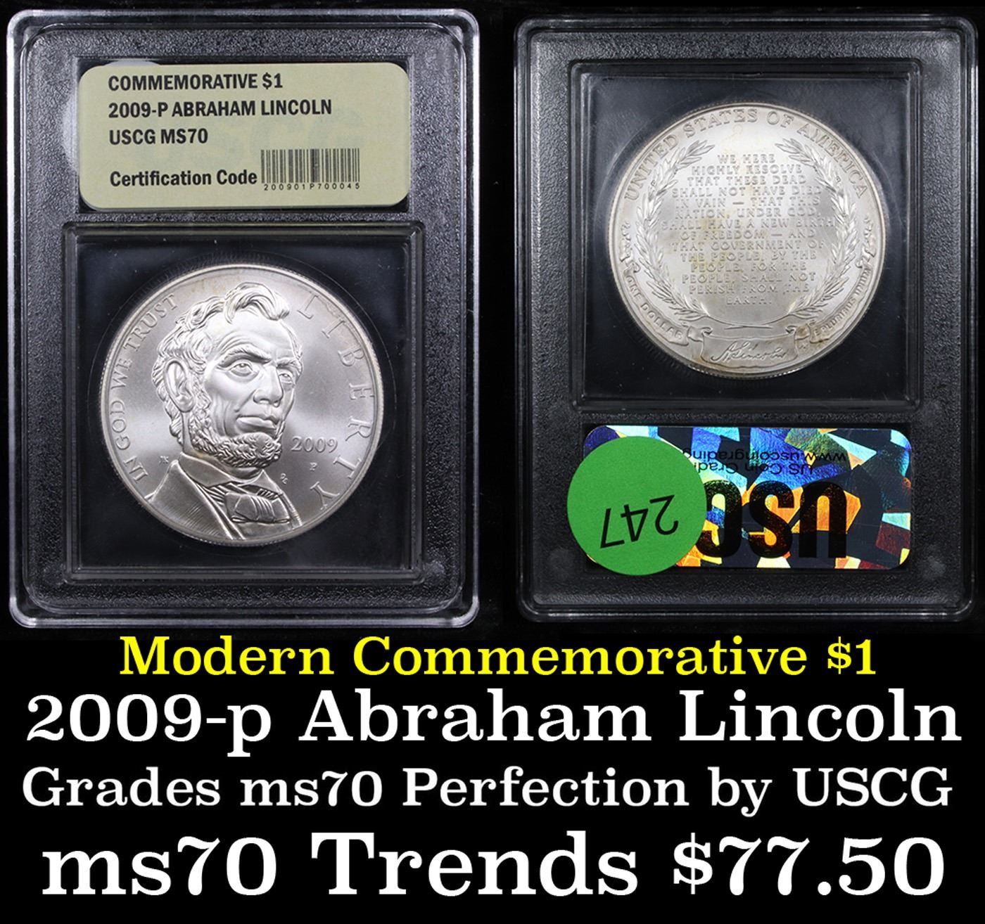 2009-p Lincoln Bicentennial Modern Commem Dollar $1 Graded ms70, Perfection By USCG. The 2009 Abraham Lincoln Silver Dollar was issued to commemorate the 200th anniversary of his birth. This 90% Silver Gem BU Dollar is encapsulated and Graded ms70 by USCG.