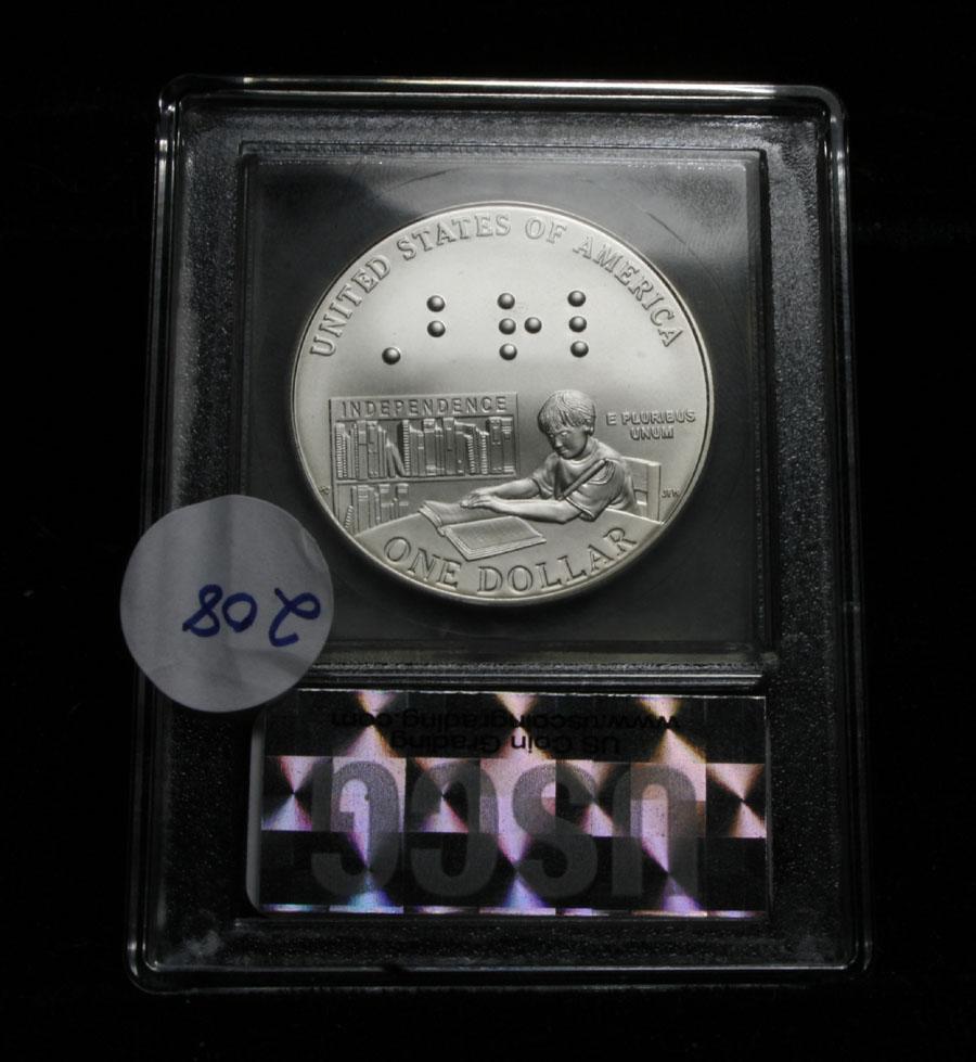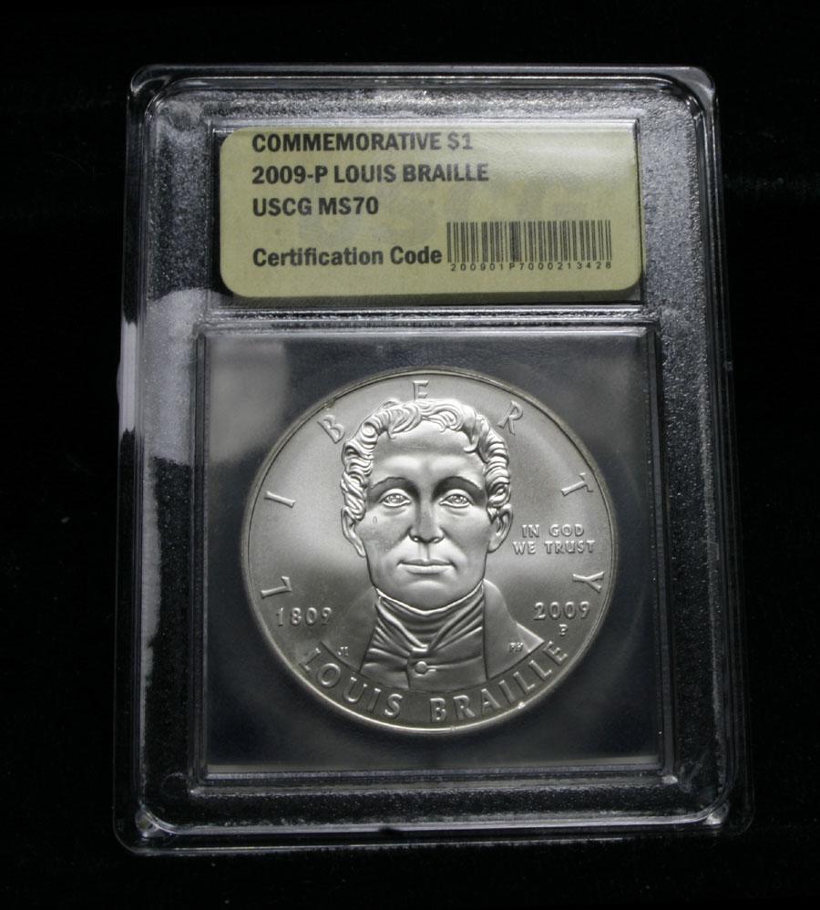A Great example of a Great Commemorative. This 2009 issue celebrates the Bicentennial of the Birth of Louis Braille. The Reverse dots stand for the letters "BRL" the contraction for Braille. PCGS Lists ms70 at $140. This coin is graded ms70 perfection by USCG. Estimated Value $75