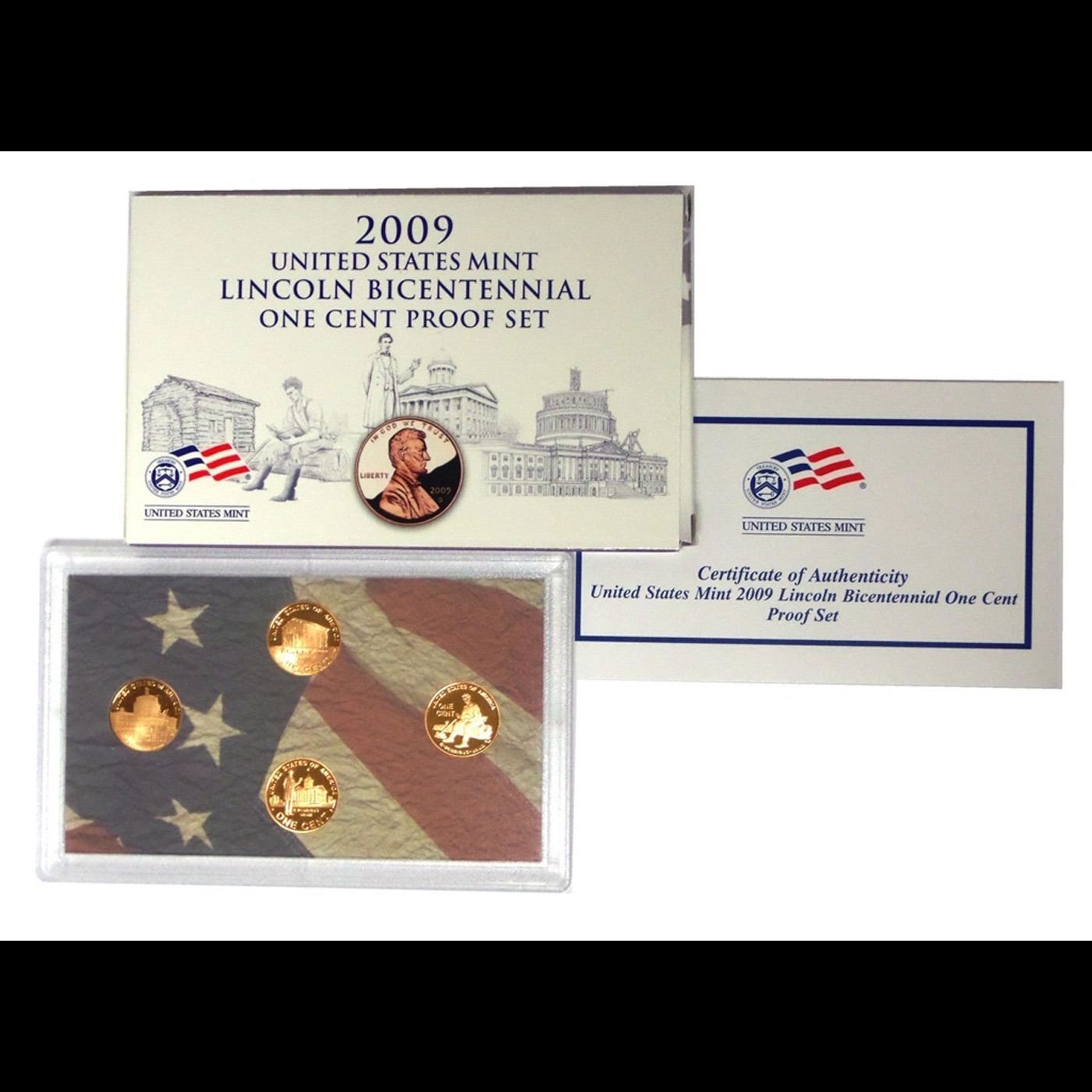 2009-s Lincoln Bicentennial United States Mint One Cent Proof Set . This lot is for a 2009-s Lincoln Bicentennial Limited Edition one cent proof set. The set includes the 4 commemorative pennies issued in 2009. The U.S. Mint struck four different Lincoln Pennies in 2009 to commemorate the 200th anniversary of Abraham Lincoln’s birth and the 100th anniversary of the first Lincoln Penny. The obverse is the original Lincoln portrait that has graced the Penny since 1909. Each of the four designs represents a different aspect or theme in the life of Lincoln. These were the first commemorative Pennies in history. They were made only in 2009 and can never be made again. The first coin honors Lincoln’s childhood in Kentucky; it features the log cabin where he was born in 1809. The second is a tribute to Lincoln’s formative years in Indiana and shows young Lincoln reading. The third depicts Lincoln’s professional life in Illinois and features him in front of the state capitol building in Springfield. The final coin honors Lincoln’s Presidency; it shows the unfinished Capitol dome to symbolize a nation divided by the Civil War. The Lincoln Penny was first made in 1909. As a 100th anniversary tribute, these 2009 Proof coins were made in the original .950 copper and .050 tin and zinc composition instead of the .975 zinc and .025 copper composition of modern circulating Pennies.