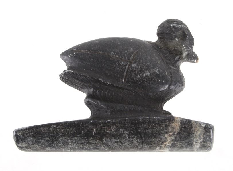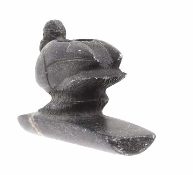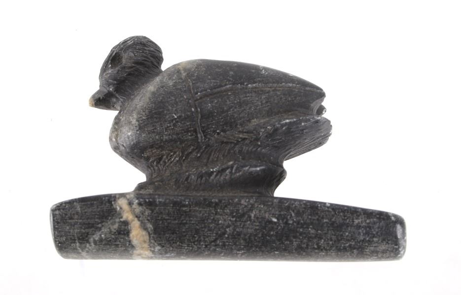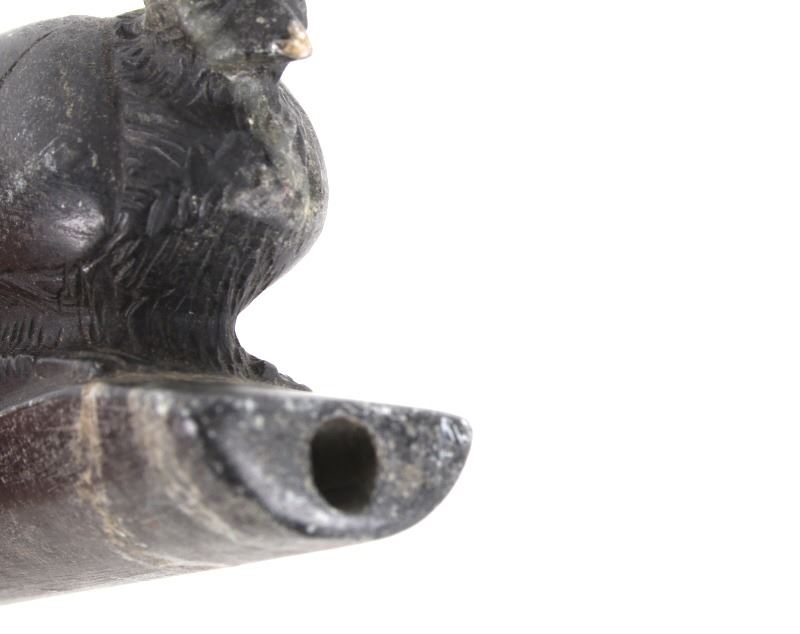 For your bidding pleasure is an Ancient Hopewell bird effigy Platform Pipe, believed to be Middle Woodland Period, dating to circa 200 BCE to 500 CE. The effigy pipe, carved of dark steatite, showcases well preserved condition and excellent craftsmanship. The pipe measures 3 1/2" x 1 1/4" x 2 1/2".