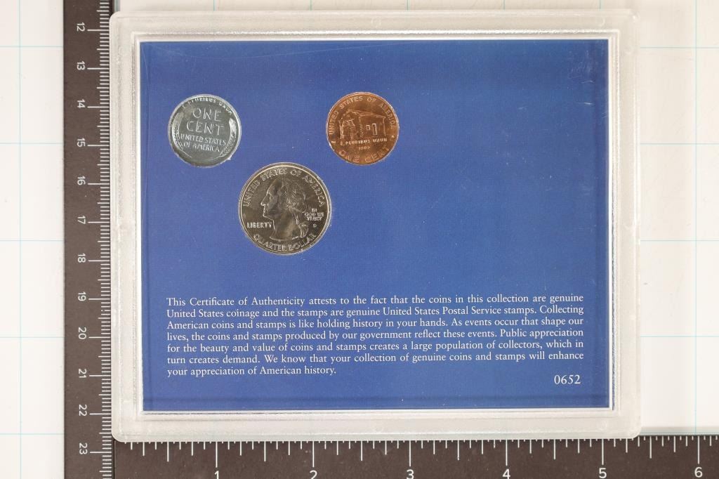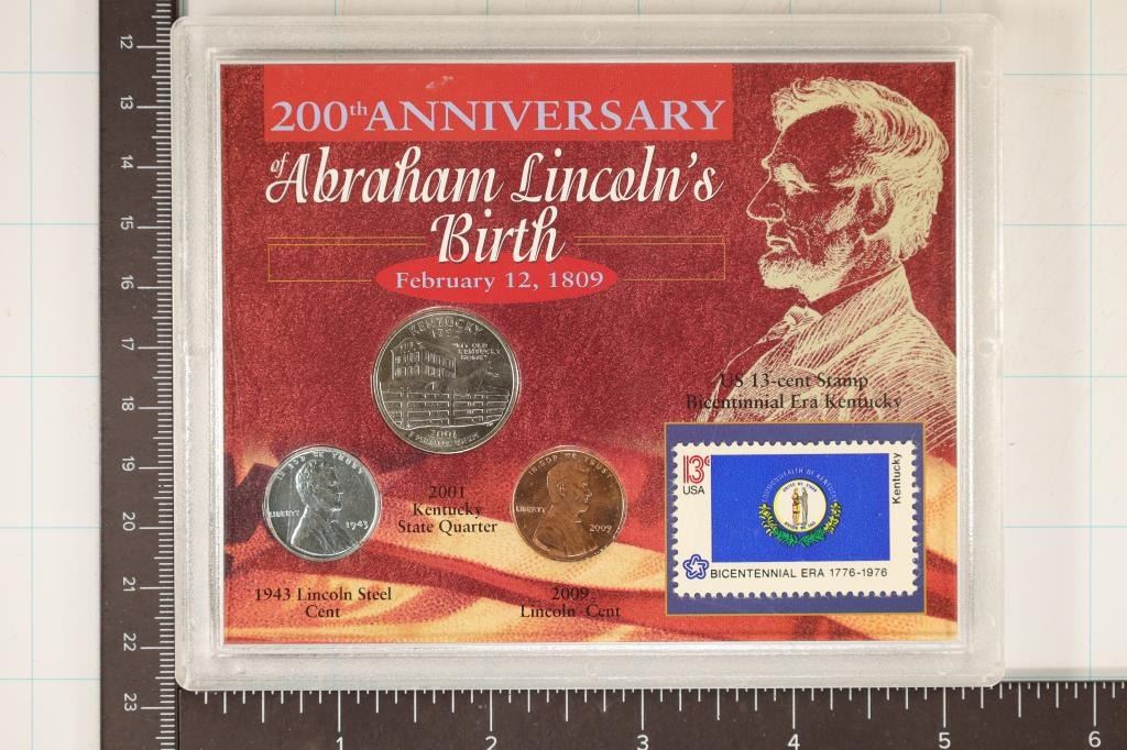 SET WITH UNCANCELLED STAMP. COINS INCLUDE: 1943 LINCOLN STEEL WAR CENTUNC, 2001 KENTUCKY QUARTER UNC AND 2009 LINCOLN CENT BU. IN HARD PLASTIC CASE