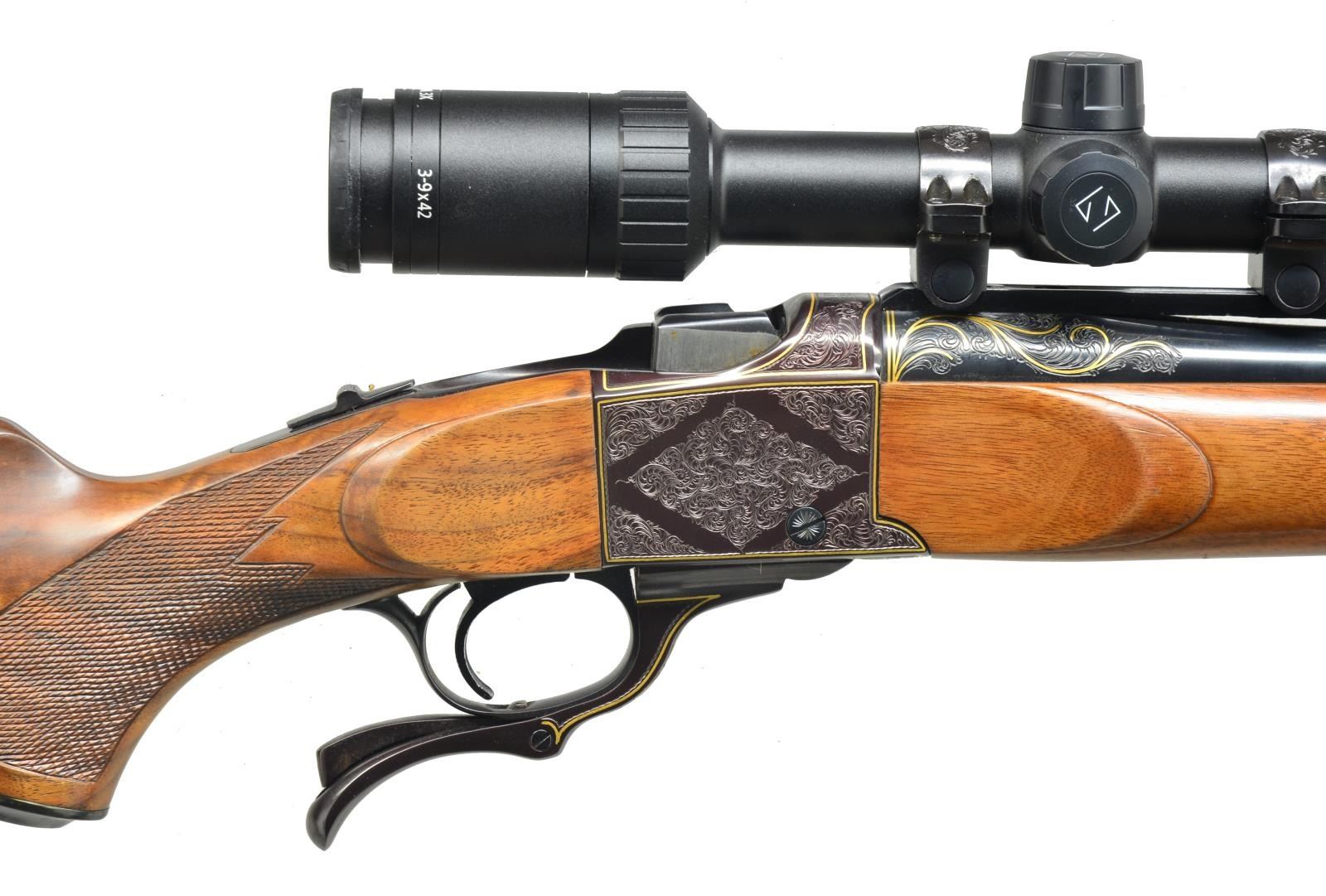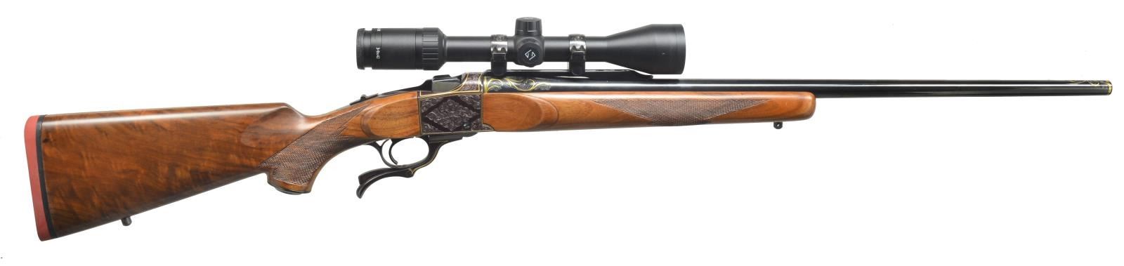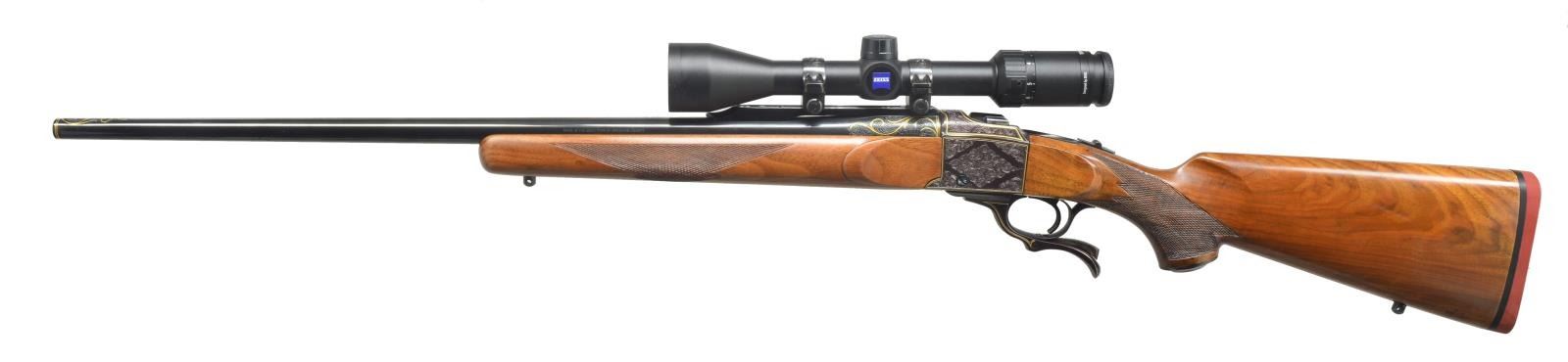 ENGRAVING & GOLD BORDER INLAY W/ SCOPE. Cal. 270 Win. S# 130-36231. Bbl. 26" medium weight factory bbl. has one line top address. Left side marked “MADE IN THE 200TH YEAR OF AMERICAN LIBERTY”. Bbl. is fitted w/ standard Ruger quarter rib. Breech area engraved w/ 2 3/4" triangles of scroll on each side which is accented by gold wire inlay. This treatment extends to top of muzzle end, which is also inlayed w/ 2 gold bands. Standard action is engraved w/ 80% coverage, varying sized scroll w/ in gold line borders. What appear to be factory stocks have had side panels enhanced w/ shadow lines. Buttstock is of nicely figured American walnut w/ Ruger pad, steel grip cap & point pattern grip checkering. Long forend is not figured. Rifle is mounted w/ Zeiss “Terra” 3X scope w/ duplex ranging reticle in engraved Ruger rings. CONDITION: very fine overall, as custom finished w/ nearly all lustrous blue on bbl. & action. There is a 2" area on left side of bbl. w/ some light marks & a bit of rust. Stocks retain nearly all oil refinish, which has run into checkering. There are a few scattered dings, mostly on butt. Sharp, shiny bore. Scope is very fine & optically clear. PROVENANCE: Collection of Alan Bradley Shepherd. (20-4003/MGM.) MODERN. $2,250-3,250.