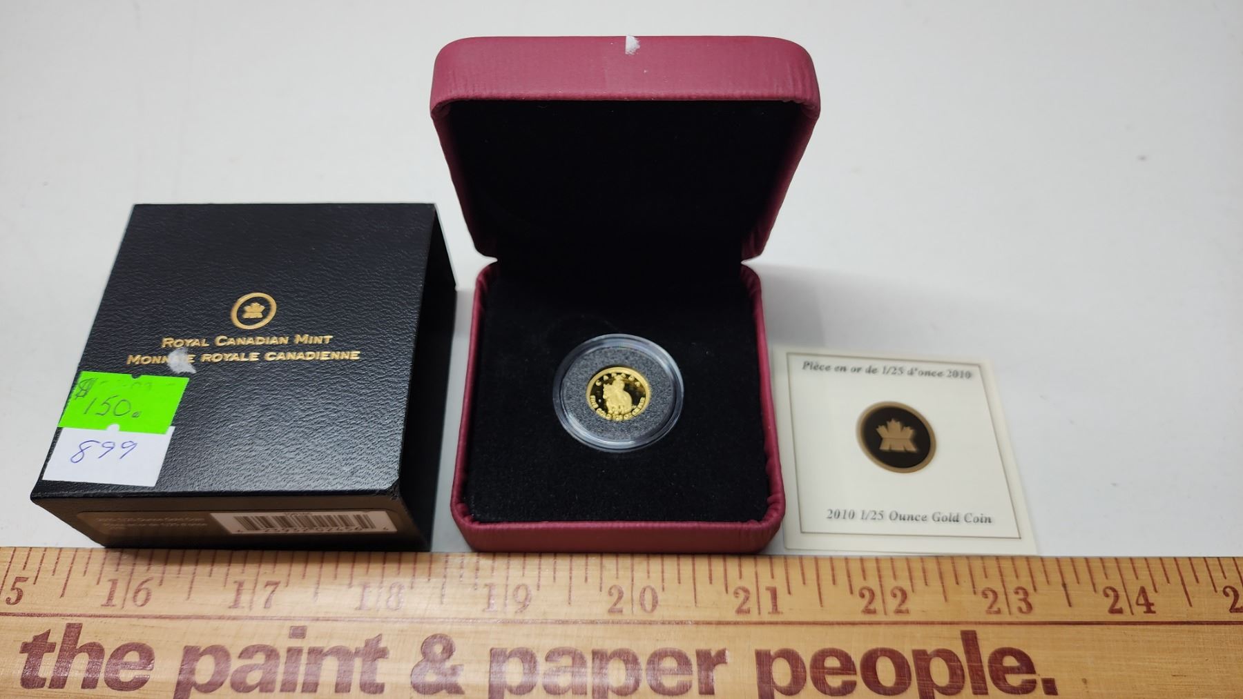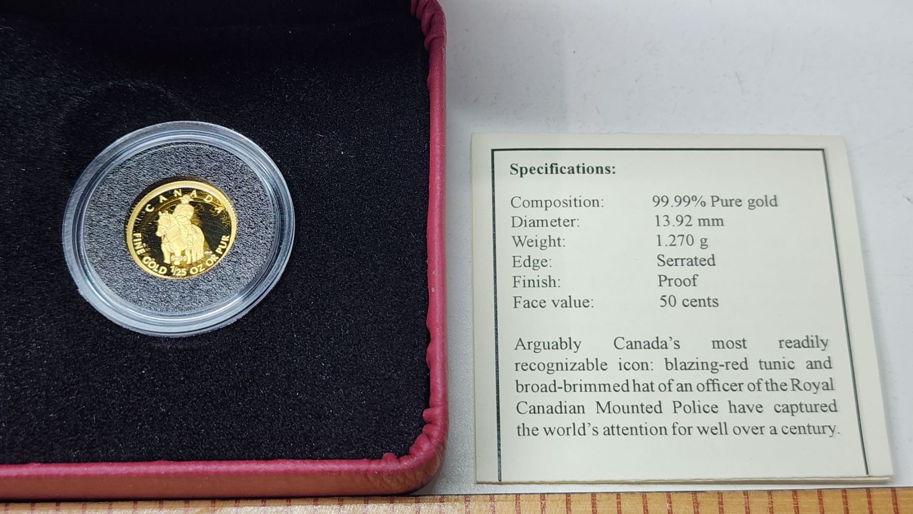 2010 - 1/25oz 99.99% fine gold, Canadian 10 cent "Mountie" coin - in case