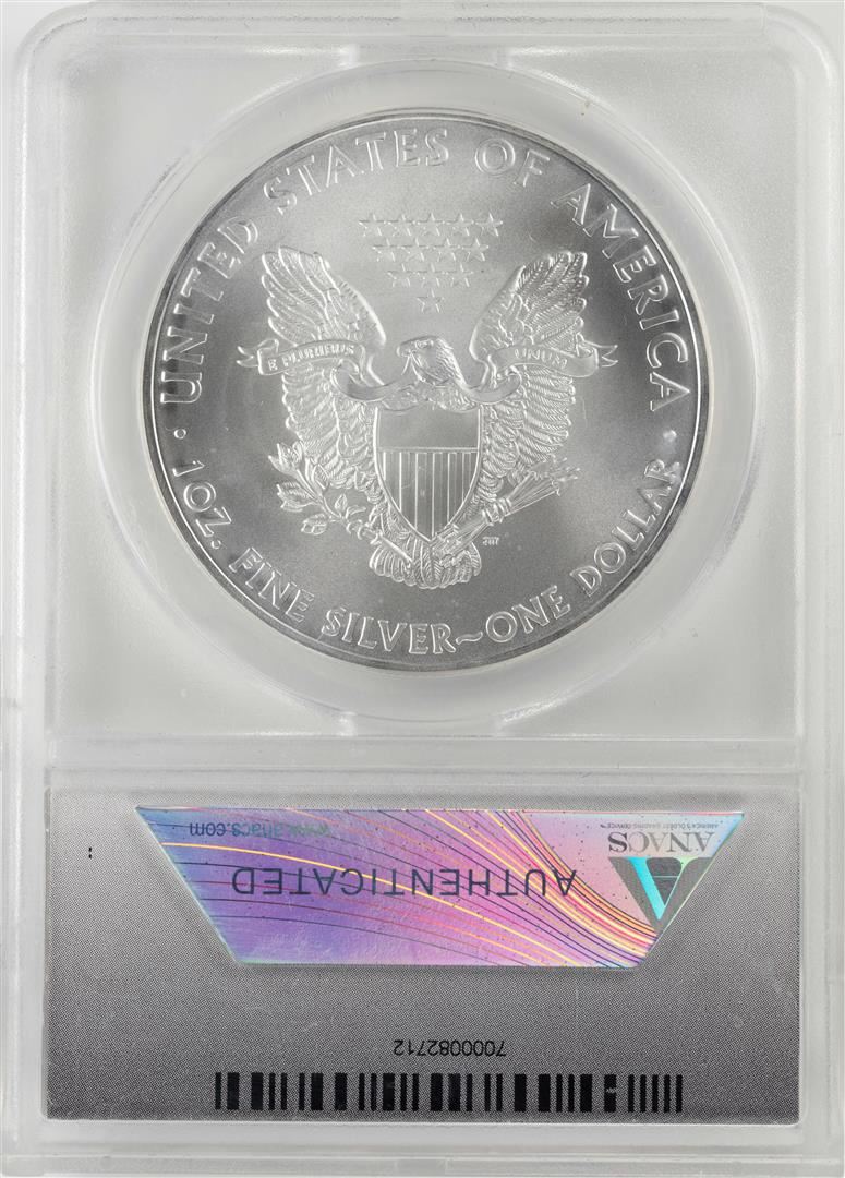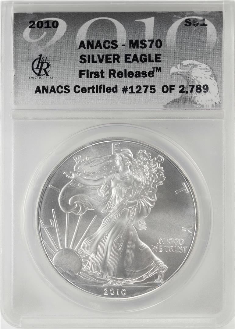 One 2010 $1 American Silver Eagle Coin ANACS MS70 First Release. ANACS Certified.