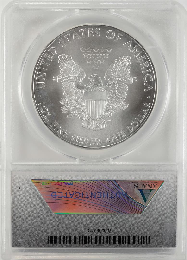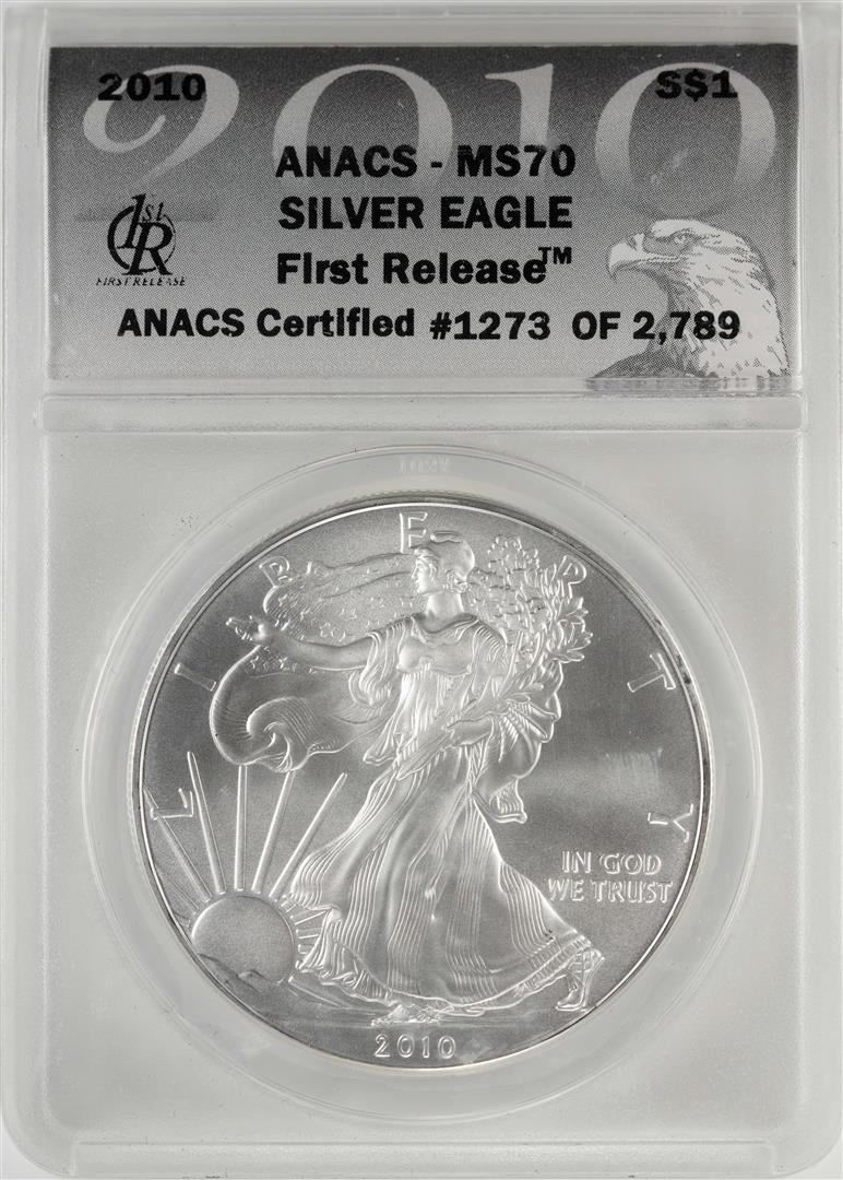One 2010 $1 American Silver Eagle Coin ANACS MS70 First Release. ANACS Certified.