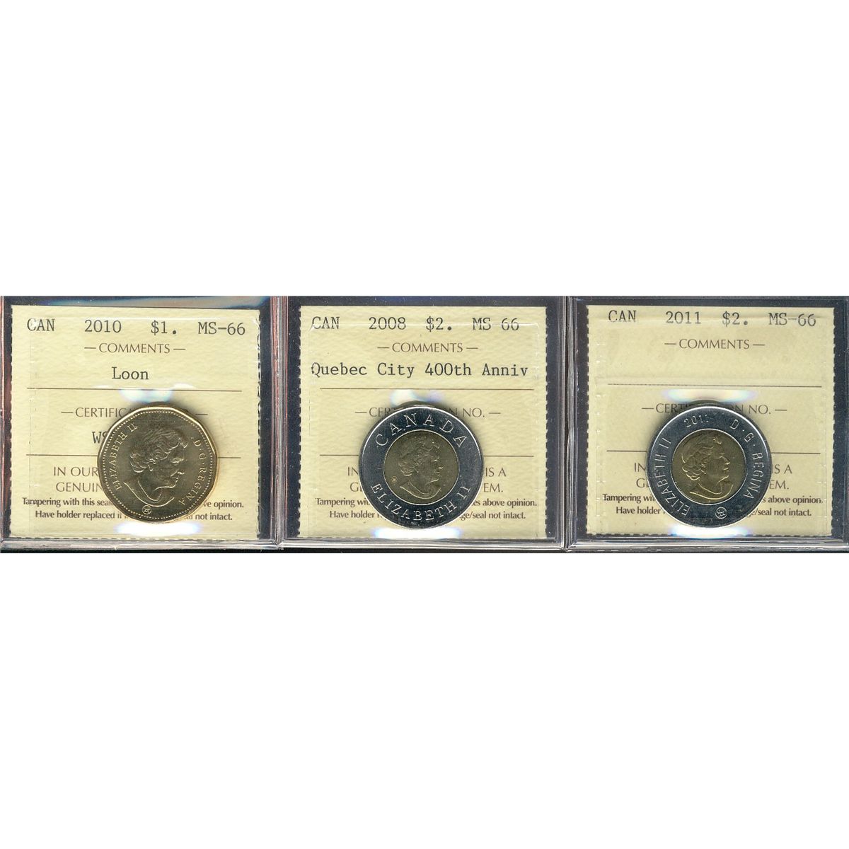 2010 $1 Loon, 2008 $2 Quebec & 2011 ICCS MS66. Lot of 3 coins.