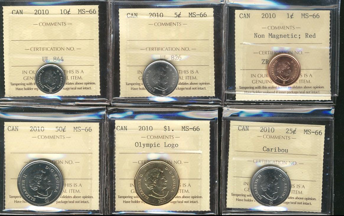 2010 1¢ to $1 ICCS MS66. Lot of 6 coins with the 1¢ being non-magnetic and the $1 with logo.