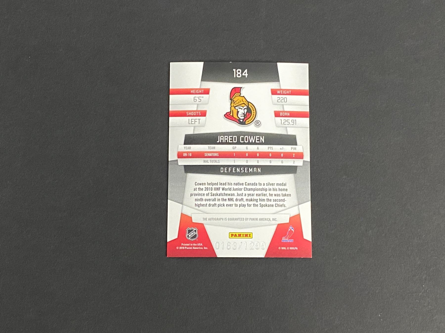 2010-11 CERTIFIED AUTOGRAPH JARED COWEN 0163/1299 N.H.L AUTOGRAPH CARD