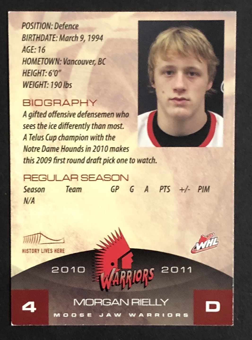 Card #4, set issued by junior team, Moose Jaw Warriors (WHL)