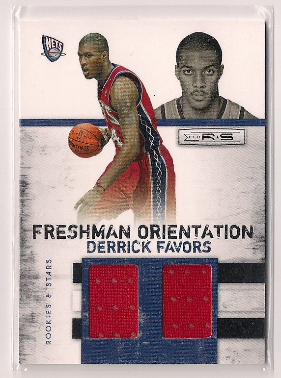 2010-11 Rookies & Stars Derrick Favors Dual Player-Worn Material Rookie Insert Card. This Rookie Insert featuers Dual Solid Red pieces of Player-Worn Material, and is serial numbered 186/399! Card is Near Mint.