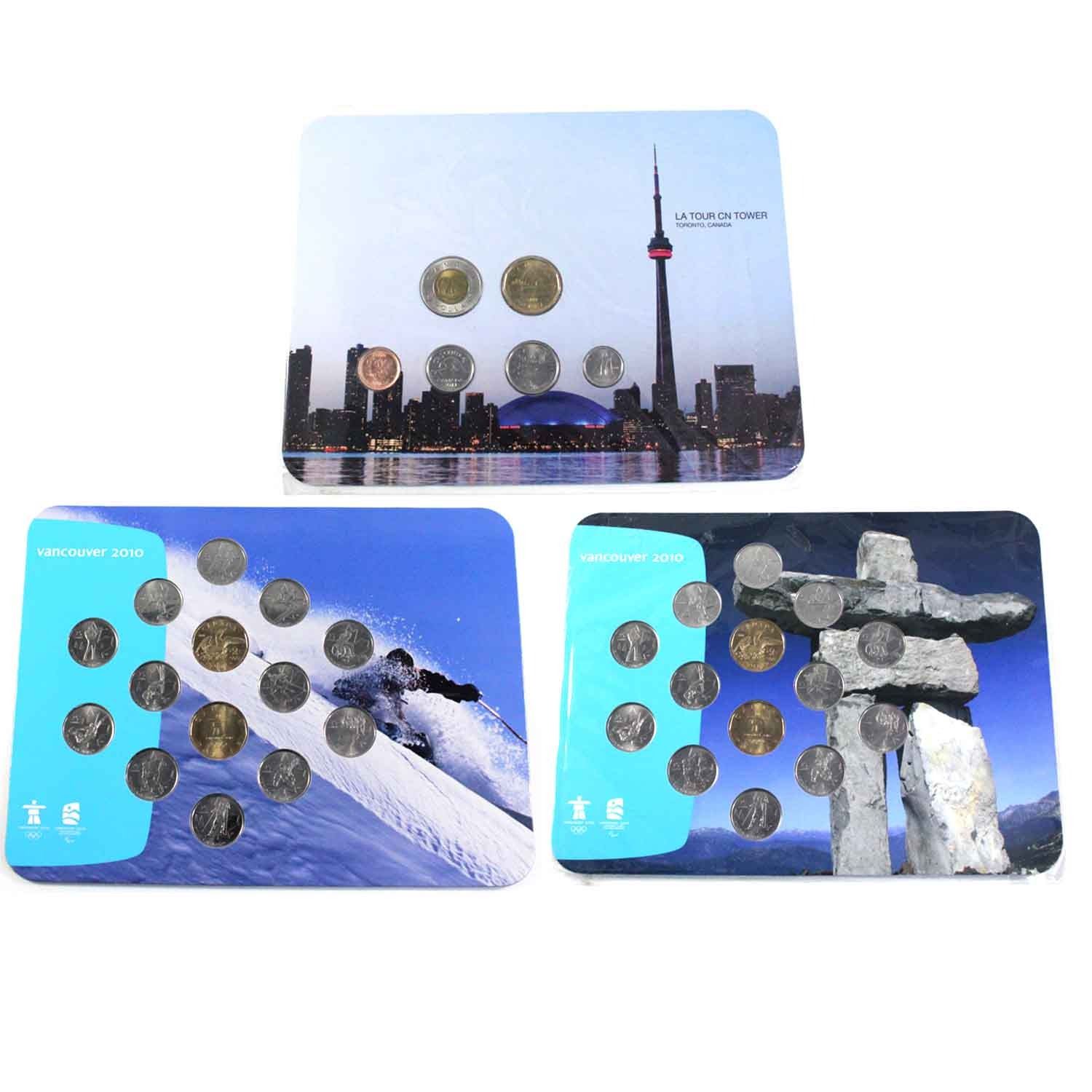 2010/2011 Canada Commemorative sets: lot includes 2007-2010 RCM Official Olympic Collector Board with 14 Coins: Skier & Inukshuk Board and the 2011 Canada CN Tower 6-coin Collector Card. 3pcs
