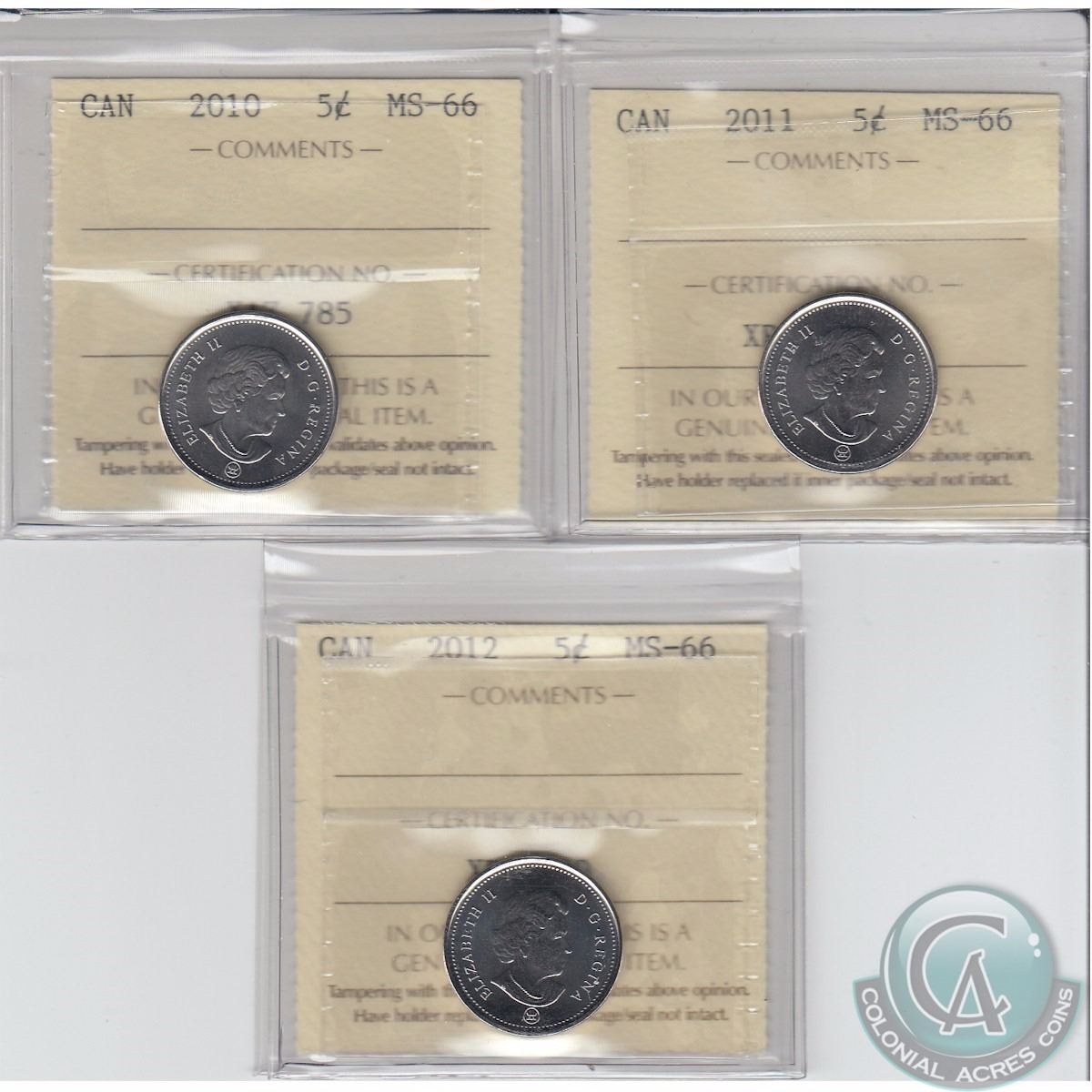 2010,2011, and 2012 Canada 5-cent All ICCS Certified MS-66 (3pcs)