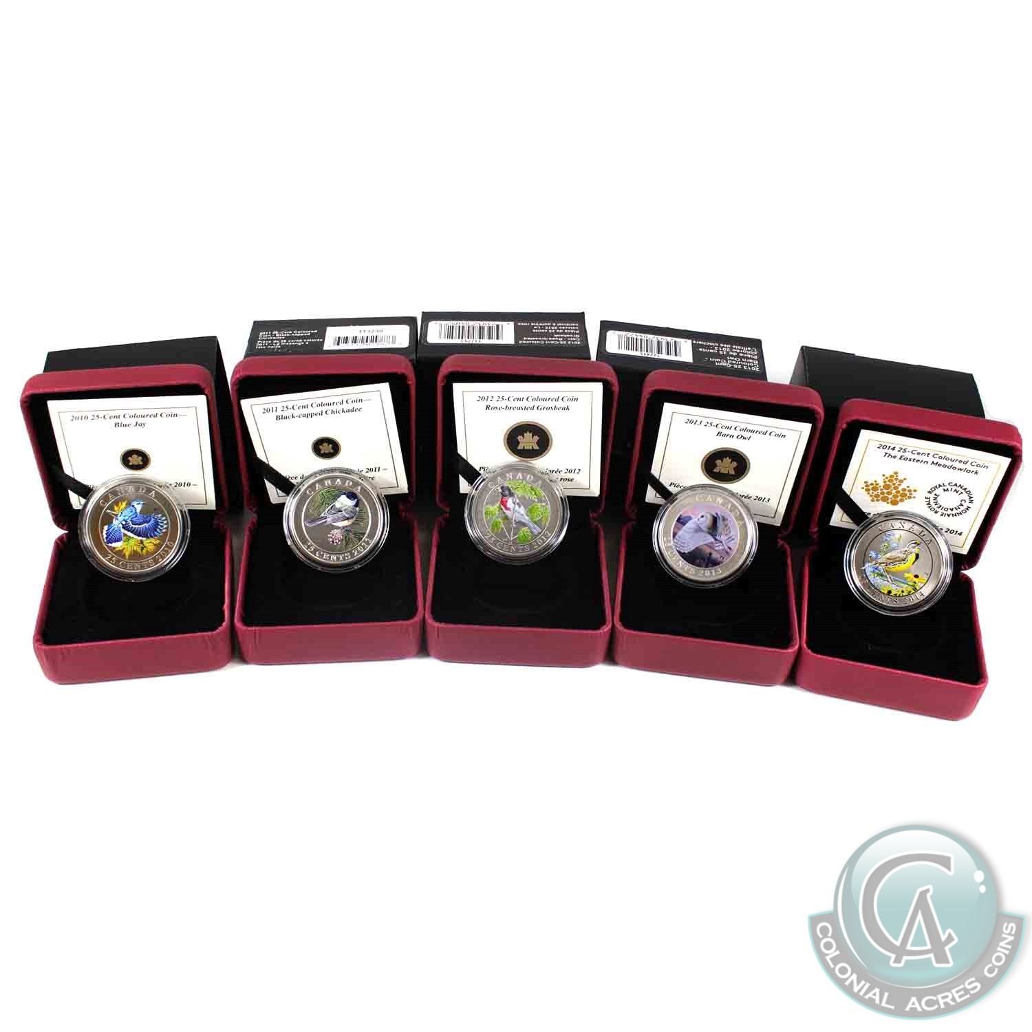 2010-2014 25-cent Birds of Canada Coloured Coin Series. You will receive 2010 Blue Jay, 2011 Black-capped Chickadee, 2012 Rose-breasted Grosbeak, 2013 Barn Owl & 2014 Eastern Meadowlark (Some sleeves have impairments). 5pcs