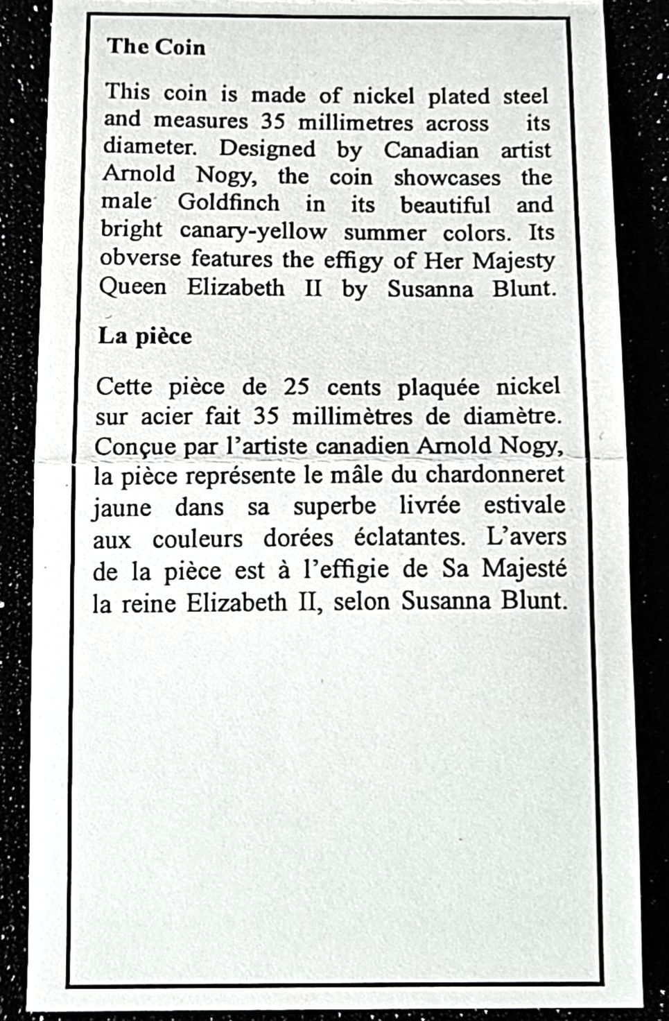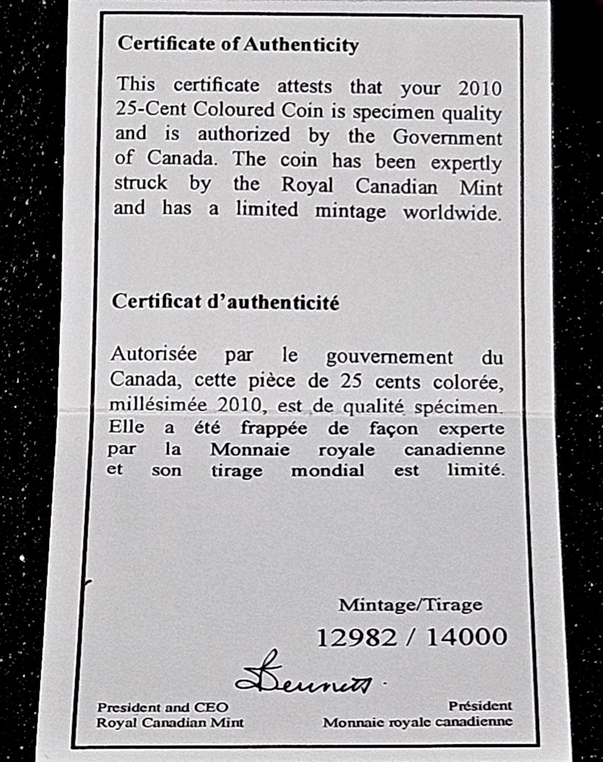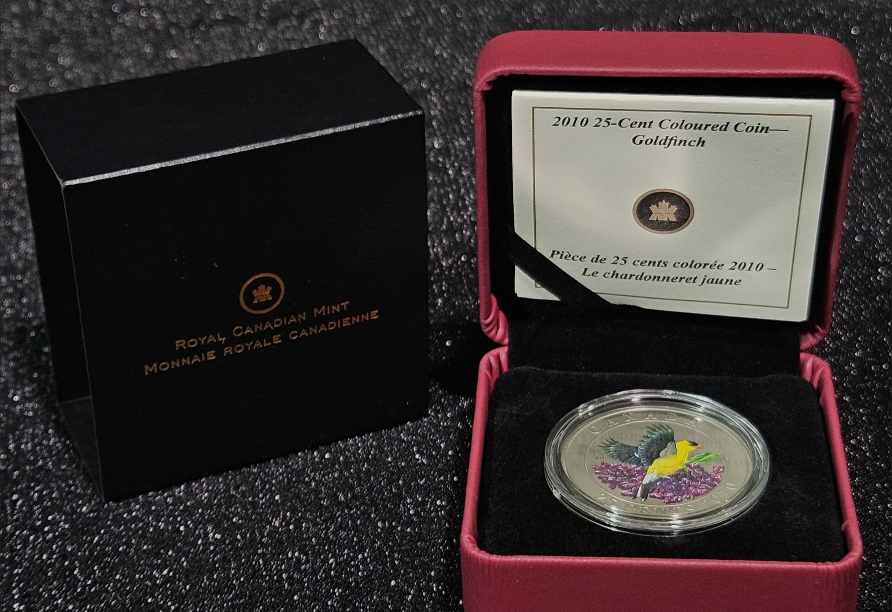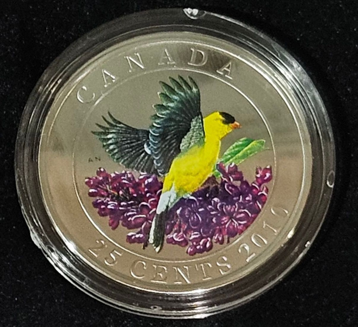 This beautiful 2010 25 cent coloured coin showcases the eye catching American Goldfinch (Carduelis tristis). Mintage is 12982/14000.