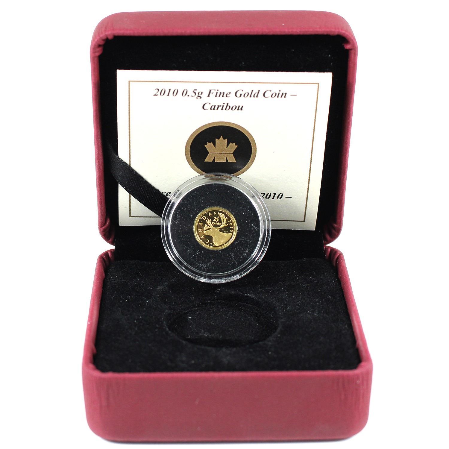 2010 25-cent Caribou 1/2g .9999 Gold Coin. Comes with clamshell case & COA (Tax Exempt)