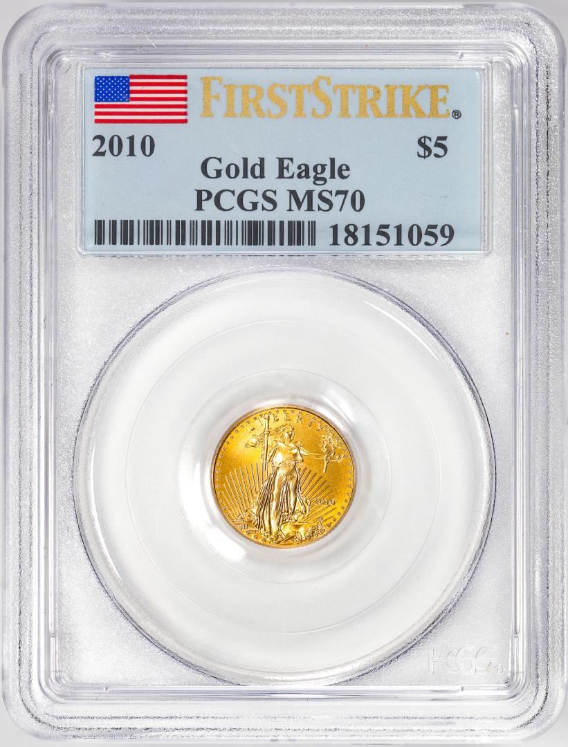 One 2010 $5 American Gold Eagle Coin PCGS MS70 First Strike. PCGS Graded.