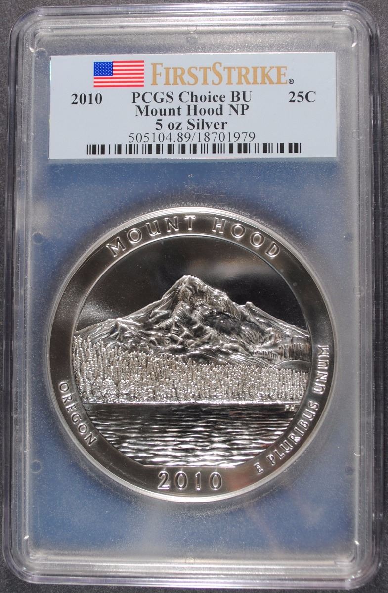 2010 5 Oz. SILVER MOUNT HOOD NATIONAL PARKS QUARTER, PCGS CHOICE BU FIRST STRIKE