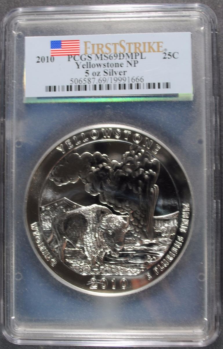 2010 5 Oz. SILVER YELLOWSTONE NATIONAL PARKS QUARTER, PCGS MS-69-DMPL 1st STRIKE