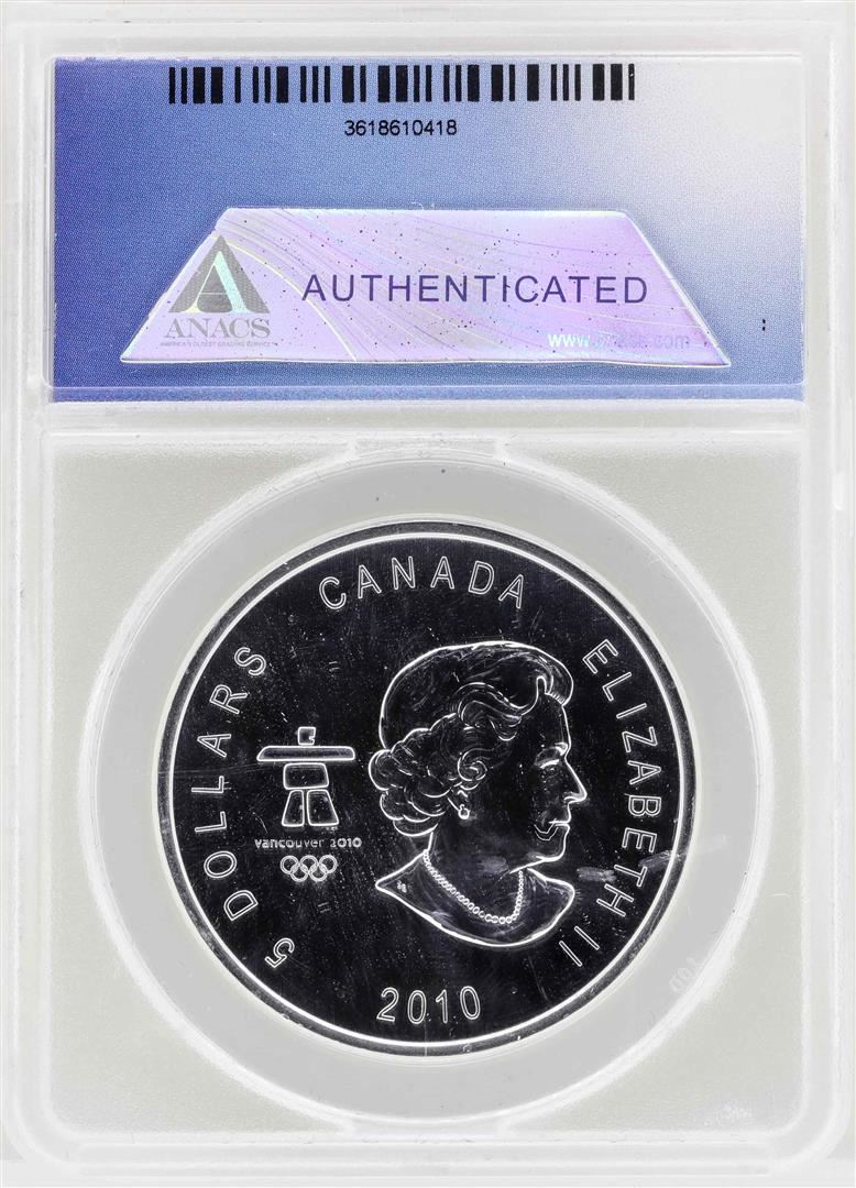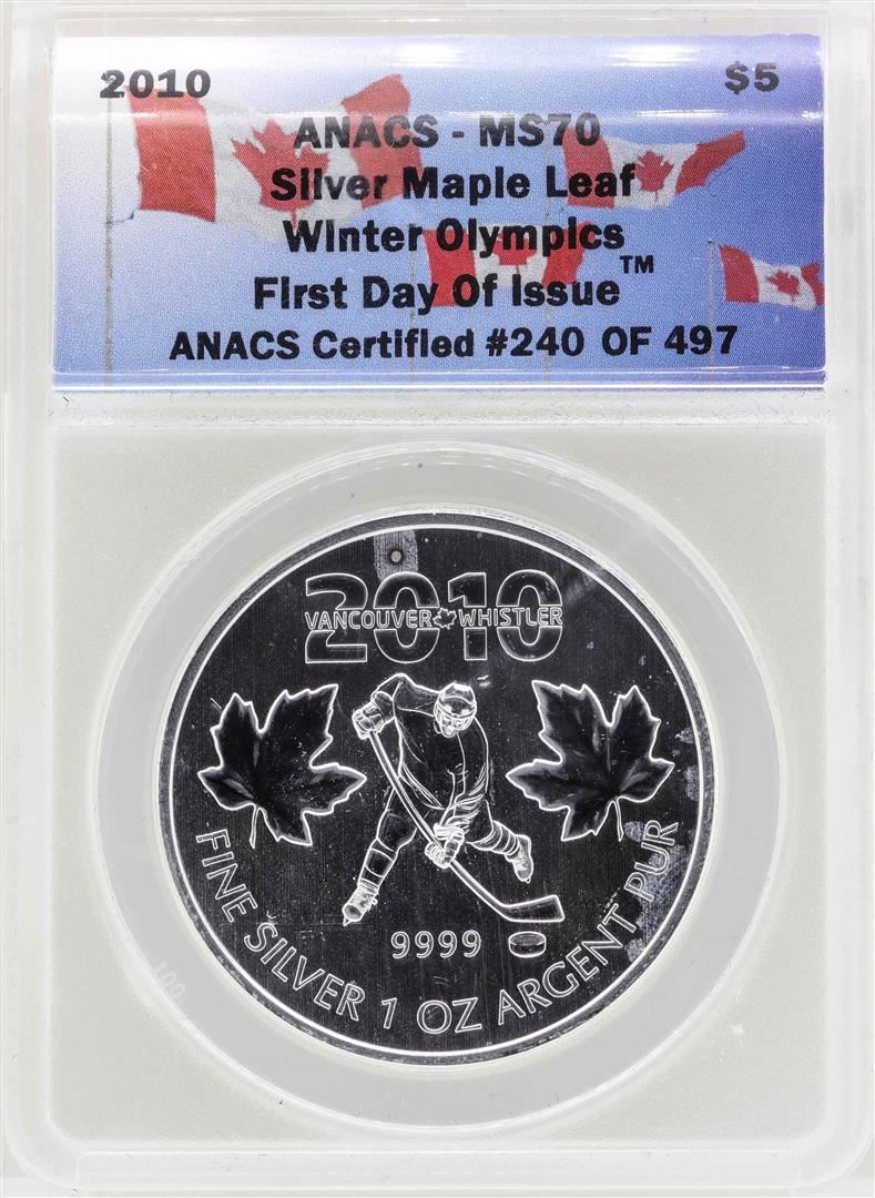 One 2010 $5 Silver Maple Leaf Silver Coin ANACS MS70. ANACS Certified.