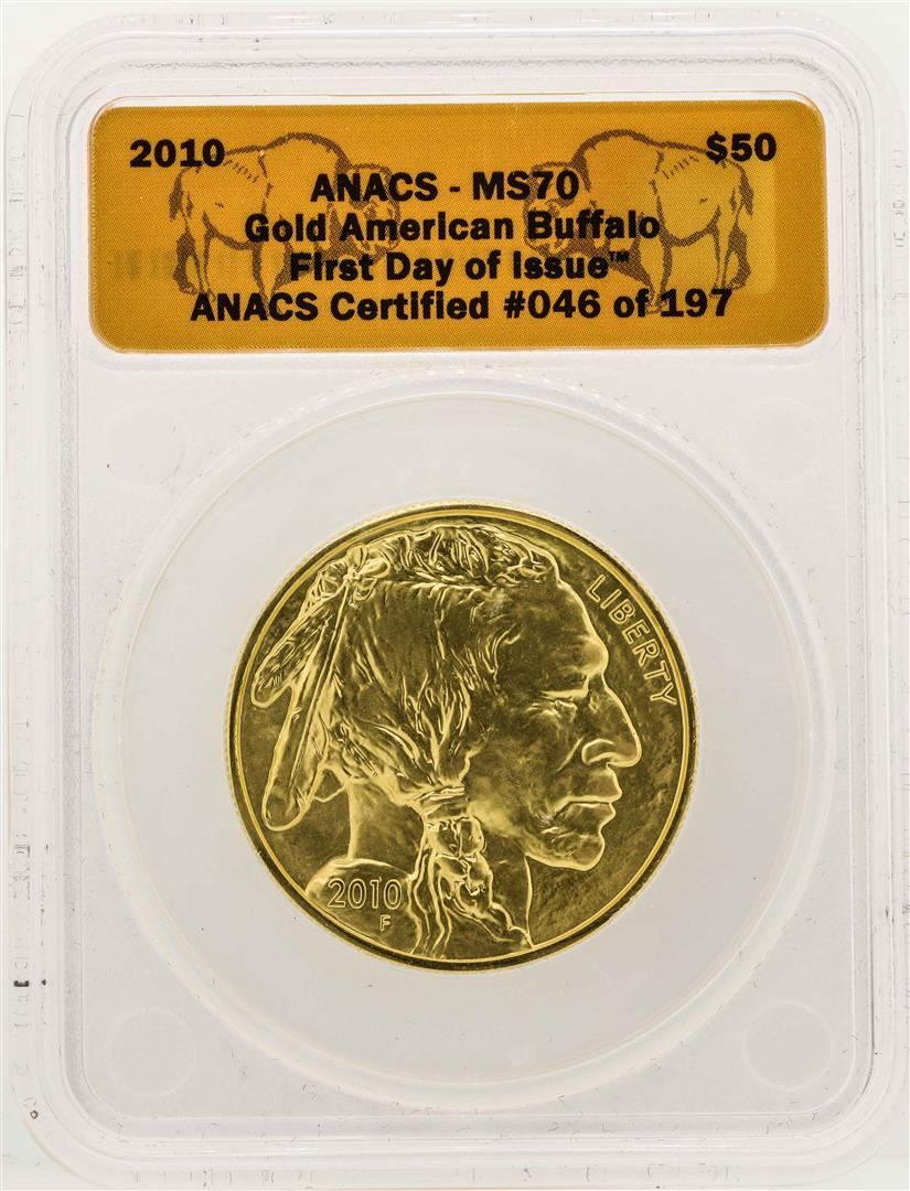 One 2010 $50 American Gold Buffalo Coin ANACS MS70 First Day of Issue. ANACS Certified.