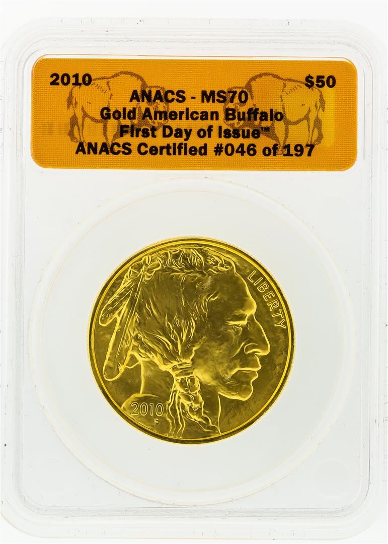 One 2010 ANACS MS70 First Day $50 American Buffalo 1 Oz. Gold Coin. ANACS Appraised.