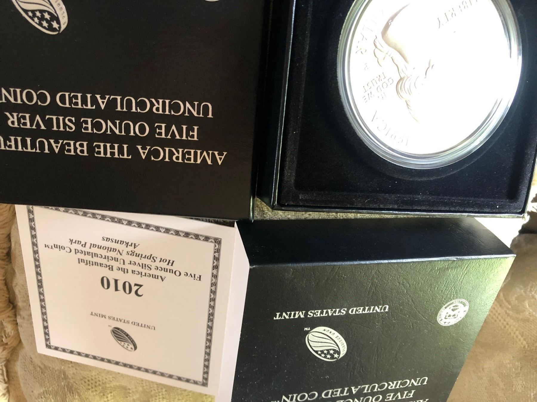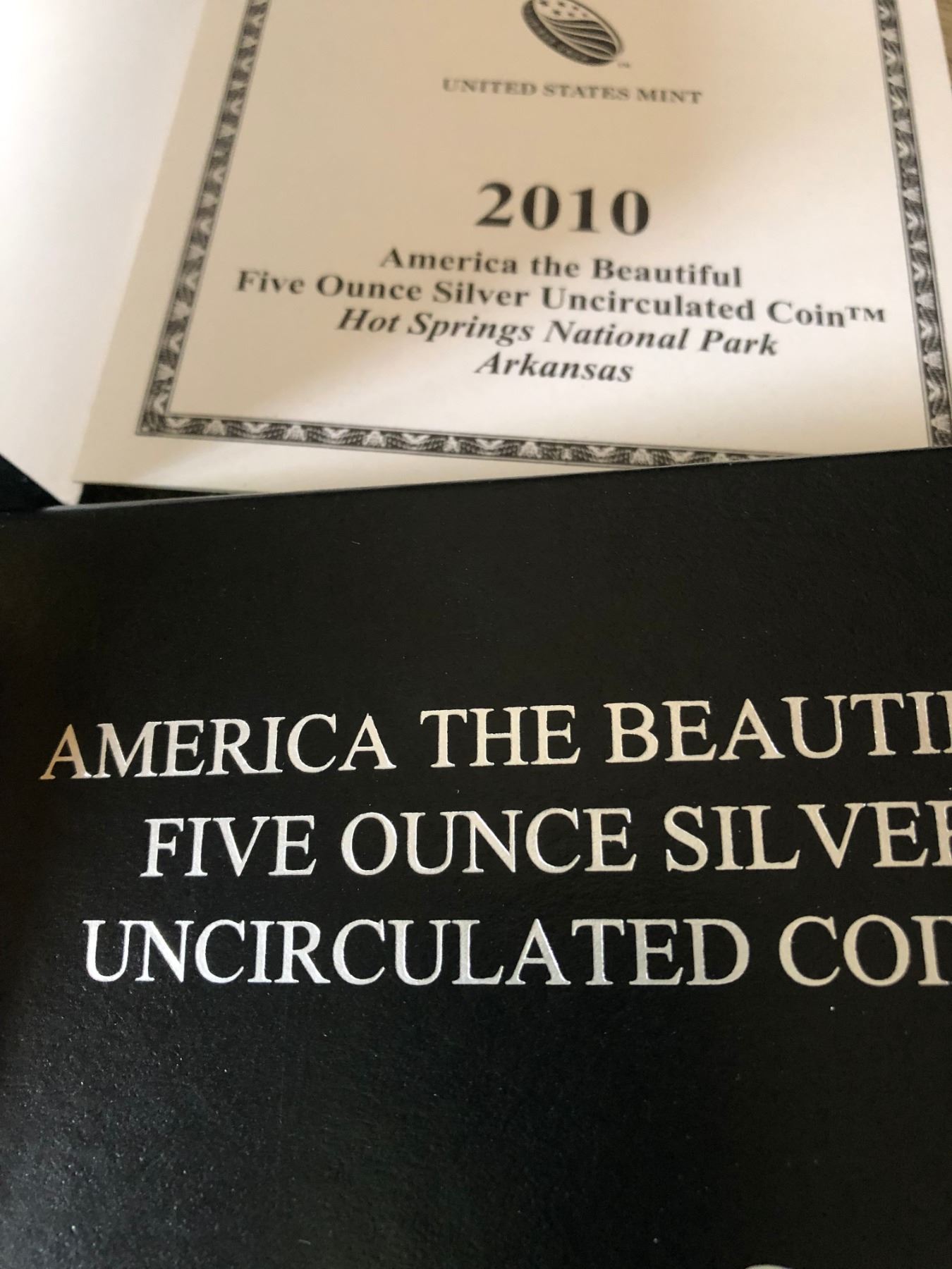 2010 America the Beautiful 5oz HOT SPRINGS NATIONAL PARK UNC Coin in Original US Mint Box with Paperwork APMEX Current Price is 250 plus Shipping and Tax