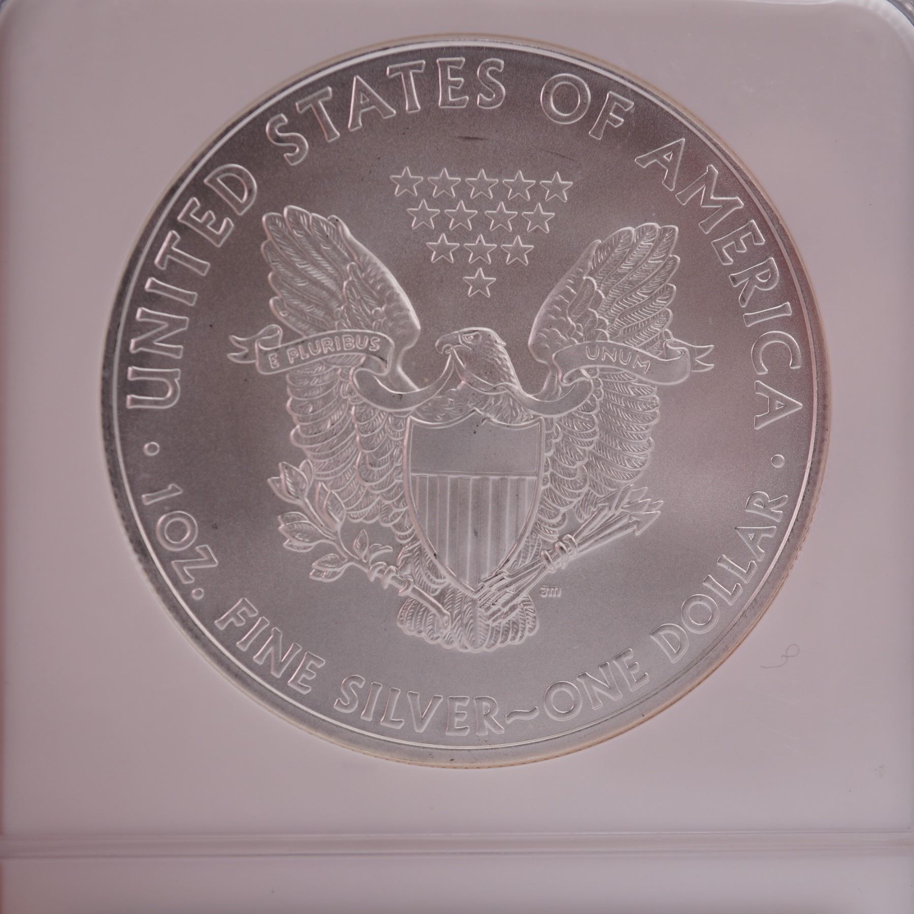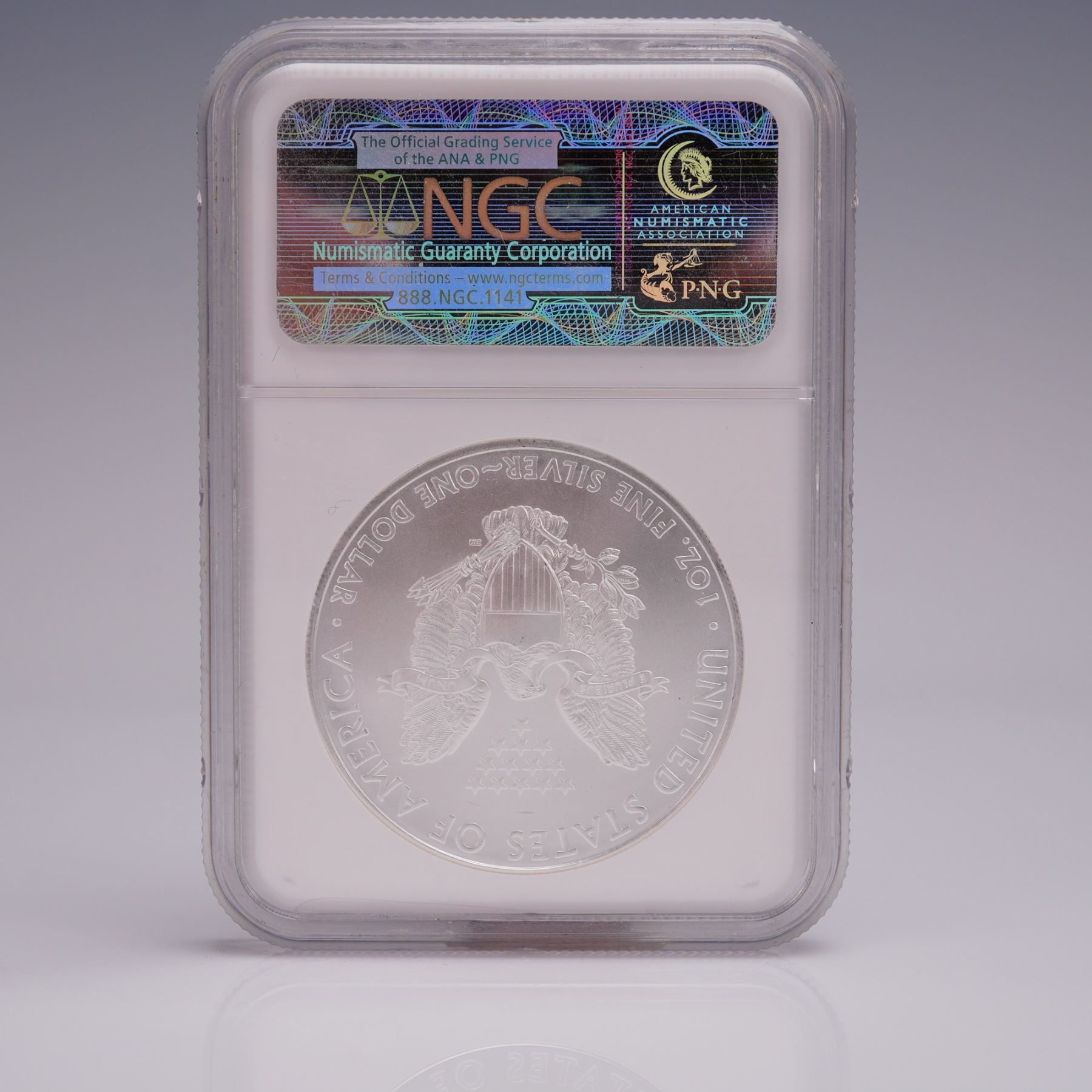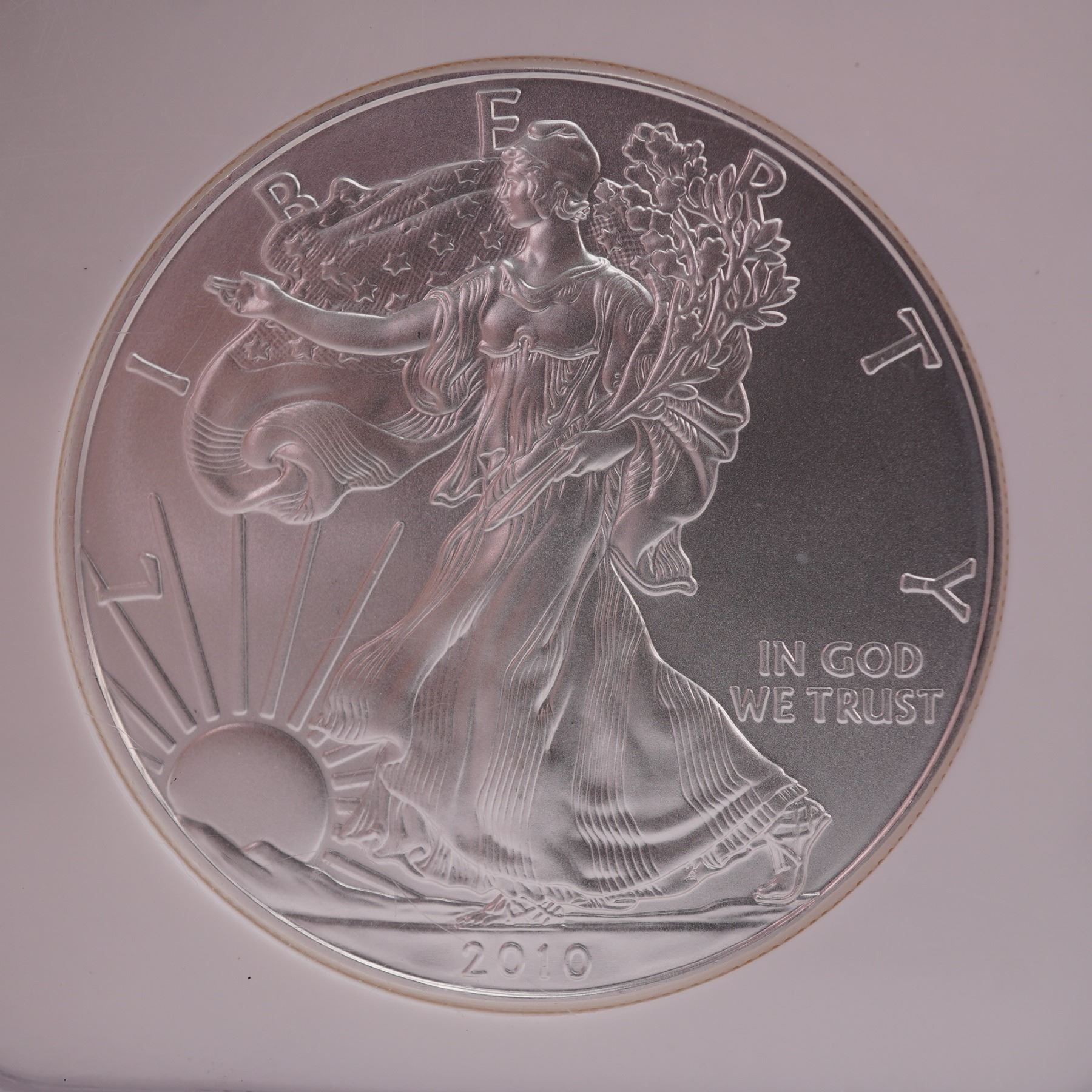 One 2010 American Silver Eagle one-ounce silver dollar, certified by NGC as MS69 and designated "Early Releases." This special-issue coin features the anniversary label commemorating 25 years of Silver Eagle production. The obverse showcases Adolph A. Weinman's classic Walking Liberty design with radiant sunrays and the inscription IN GOD WE TRUST. The reverse bears John Mercanti's heraldic eagle with shield, clutching arrows and an olive branch, beneath thirteen stars symbolizing the original colonies. Encased in a graded NGC holder for further preservation and authentication. Slab measures: 2.25"L x 0.25"W x 3.25"H. Coin diameter: 40.6 mm.