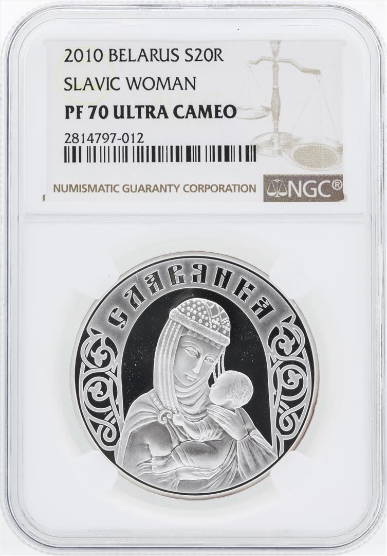 One 2010 Belarus 20 Roubles Slavic Woman Silver Coin NGC PF70 Ultra Cameo.
