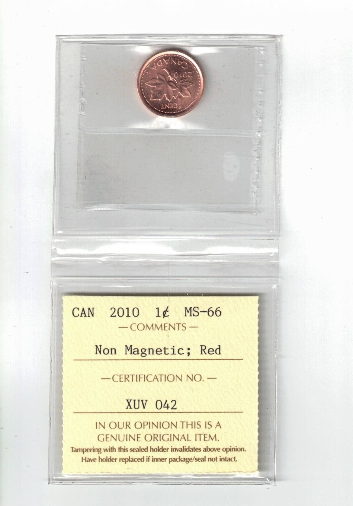 2010 Canada 1¢; Red; Non Magnetic, Certified ICCS MS66