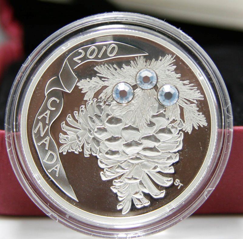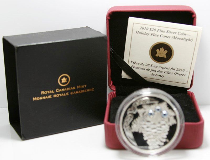 2010 Canadian $20 Fine Silver Coin - Holiday Pine Cones (Moonlight) - With Swarovski Elements