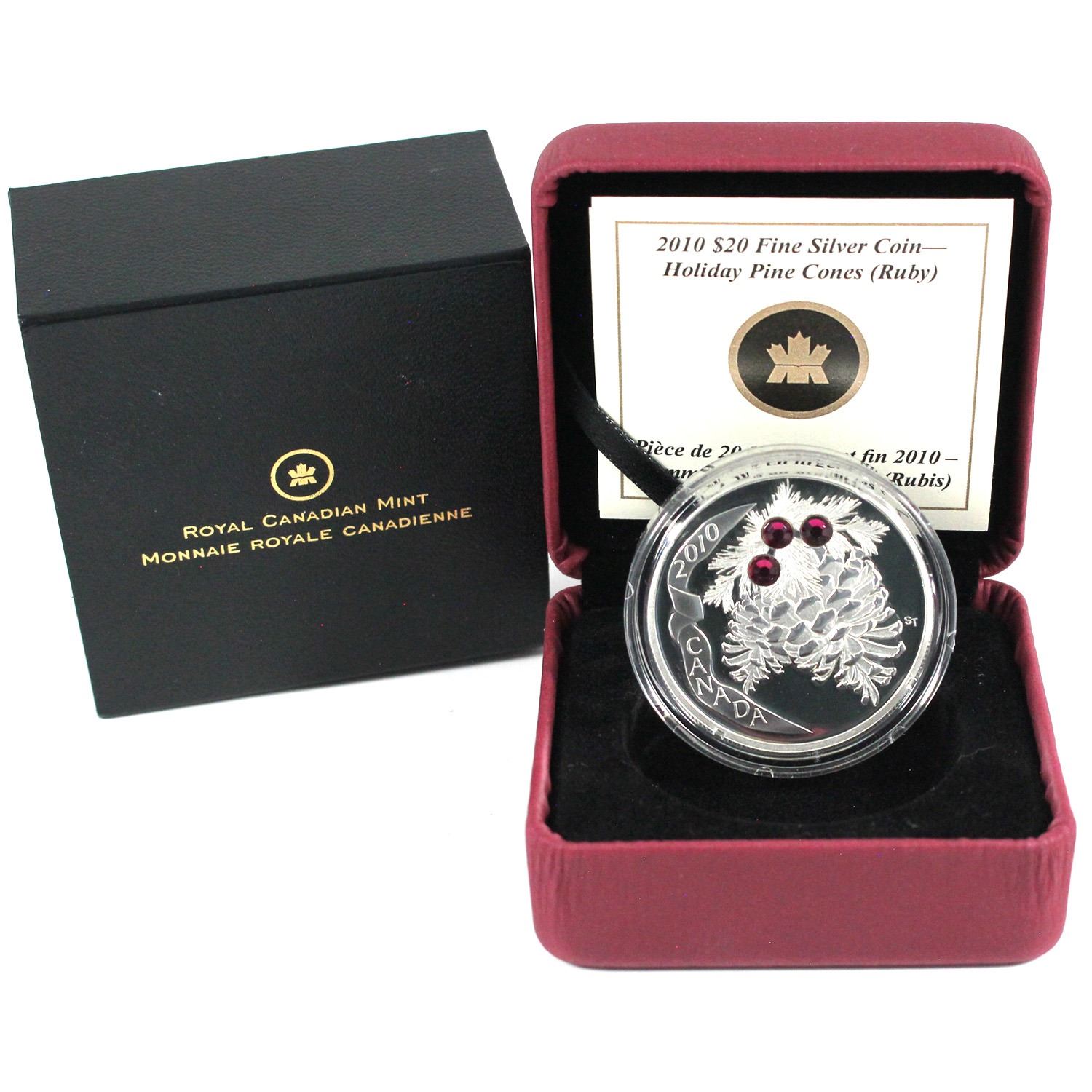2010 Canada $20 Ruby Crystal Pinecone Fine Silver Coin (Capsule lightly scratched).