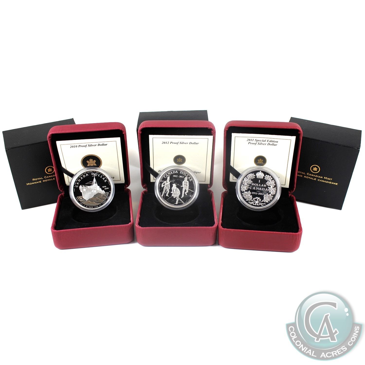 2010 Canadian Navy Centennial, 2011 Special Edition 1911 Silver Dollar Centennial & 2012 War of 1812 Bicentennial Proof Silver Dollars. 3pcs
