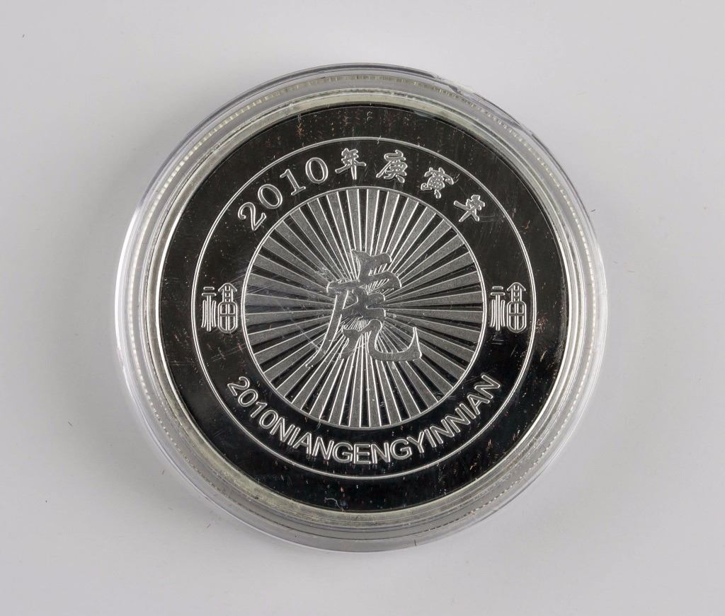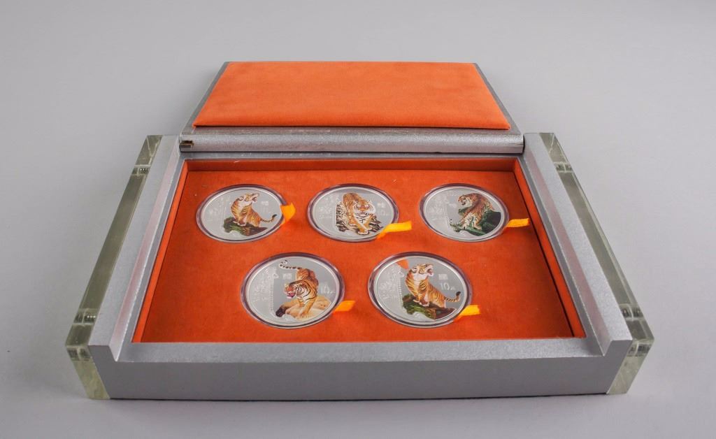 2010 Chinese Tiger year commemorative 10 Yuan coin; five coins with different obverse design of tiger; reverse lettering Fu, Hu, Fu, 2010 NIAN GENG YIN NIAN; with box; 14 cm x 22 cm, 735 grams