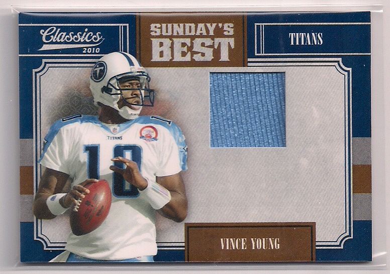 2010 Classics Sunday's Best Vince Young Game-Worn Jersey Insert Card. This Insert features a Light Blue piece of Game-Worn Jersey, and is serial numbered 225/299! Card is Near Mint.