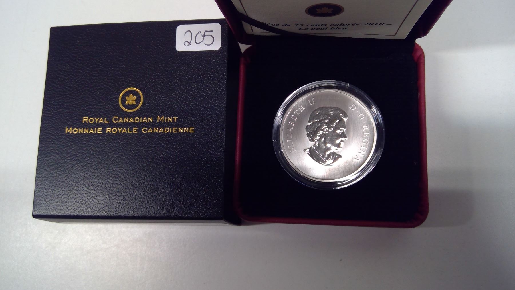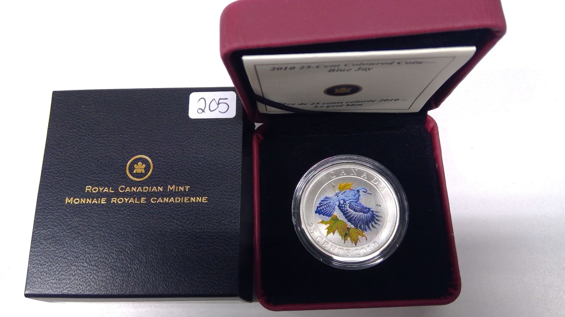 2010 Coloured Blue Jay 25 Cents. Specimen. Housed in its original case and box of issue.