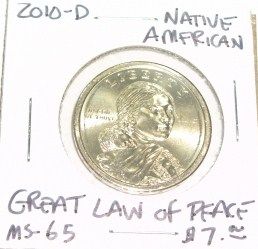 2010-D NATIVE AMERICAN $1 COIN RED BOOK VALUE IS $7.00 *RARE MS-65 HIGH GRADE GREAT LAW OF PEACE*!! ***Coin, Currency & All Items Listed in this auction - Grades, Conditions and Values are not Safe Deposit Coins LLC Responsibilty. Grades, Condition and Values are determined by Consigner(s) & Buyers ONLY