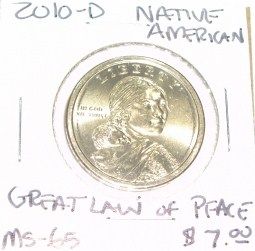 2010-D NATIVE AMERICAN $1 COIN RED BOOK VALUE IS $7.00 *RARE MS-65 HIGH GRADE GREAT LAW OF PEACE*!! ***Coin, Currency & All Items Listed in this auction - Grades, Conditions and Values are not Safe Deposit Coins LLC Responsibilty. Grades, Condition and Values are determined by Consigner(s) & Buyers ONLY