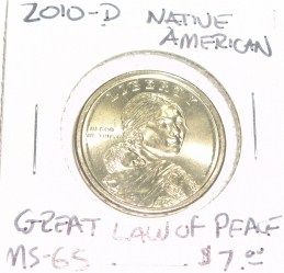 2010-D NATIVE AMERICAN $1 COIN RED BOOK VALUE IS $7.00 *RARE MS-65 HIGH GRADE GREAT LAW OF PEACE*!! ***Coin, Currency & All Items Listed in this auction - Grades, Conditions and Values are not Safe Deposit Coins LLC Responsibilty. Grades, Condition and Values are determined by Consigner(s) & Buyers ONLY