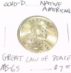 2010-D NATIVE AMERICAN $1 COIN RED BOOK VALUE IS $7.00 *RARE MS-65 HIGH GRADE GREAT LAW OF PEACE*!! ***Coin, Currency & All Items Listed in this auction - Grades, Conditions and Values are not Safe Deposit Coins LLC Responsibilty. Grades, Condition and Values are determined by Consigner(s) & Buyers ONLY